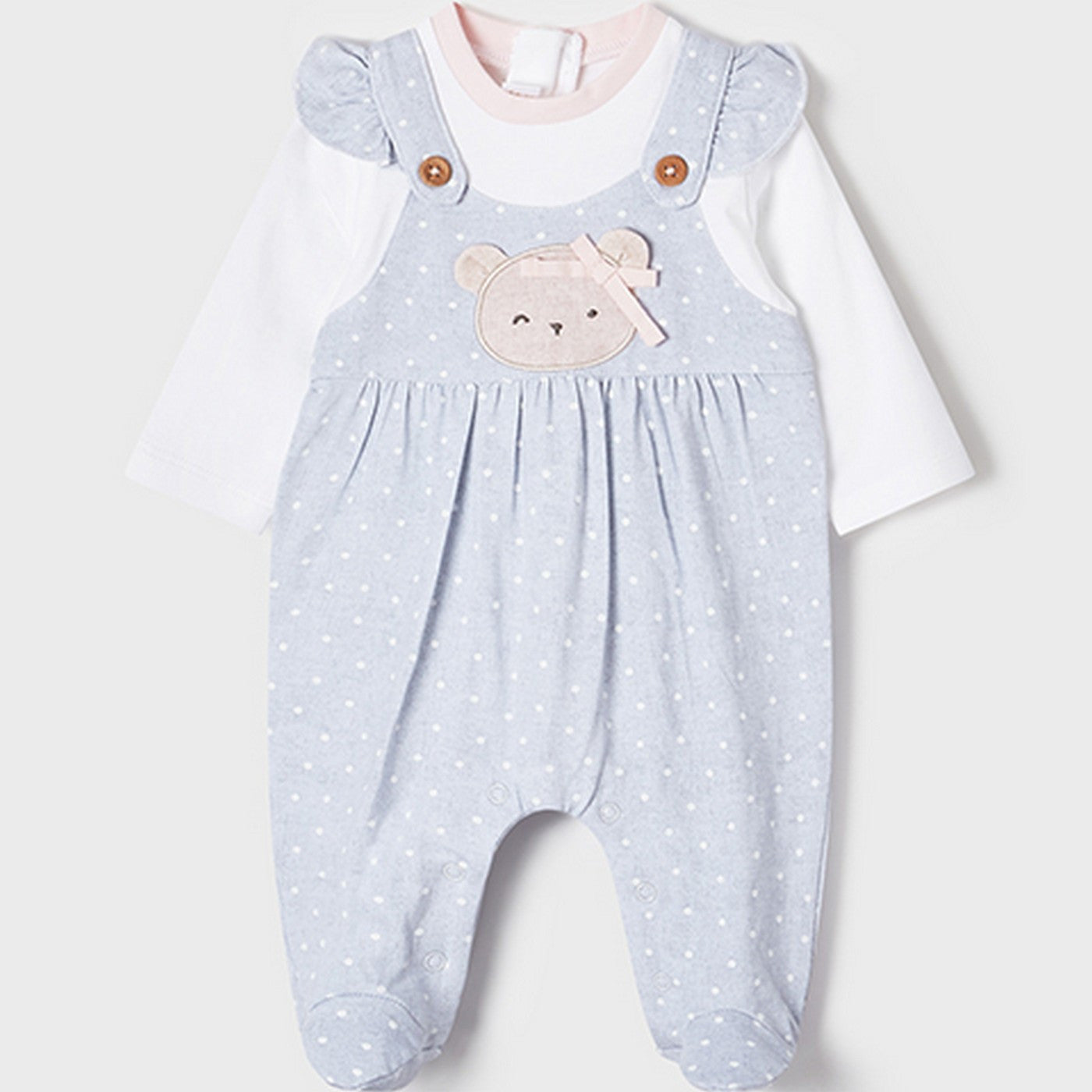 -Anzug mit unechter grauer Latzhose und Aufdruck auf der Vorderseite.