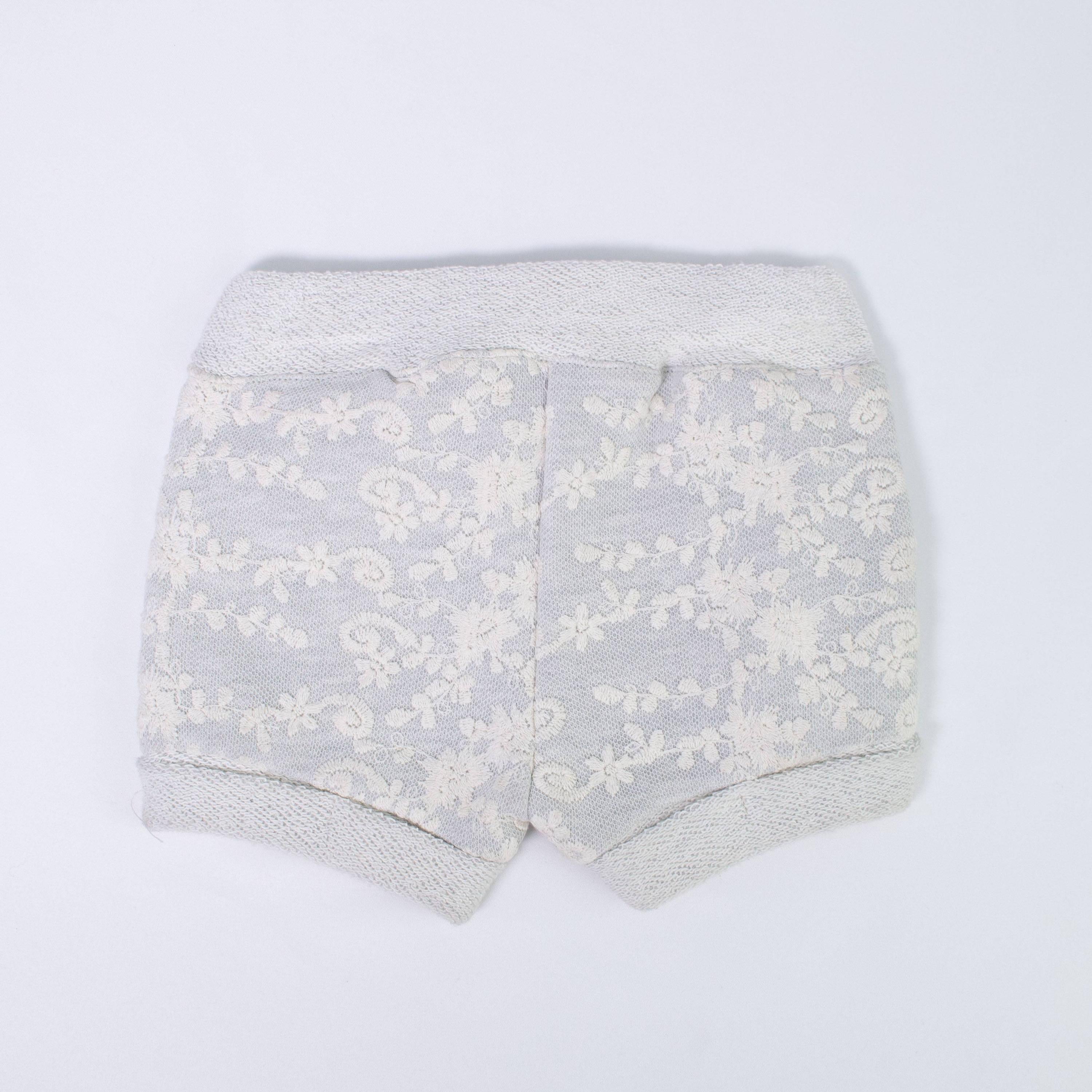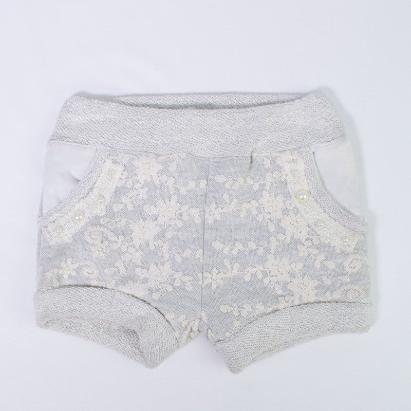 Short aus warmer hellblauer Baumwolle mit Blumenstickerei und Perlen entlang der Taschen