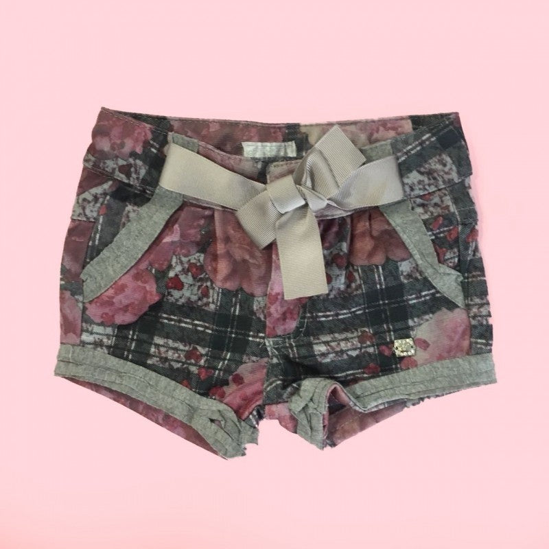 -Shorts aus warmer violetter Baumwolle mit Blumen- und Herzdrucken, America-Taschen und Ripsbandschleife an der Taille