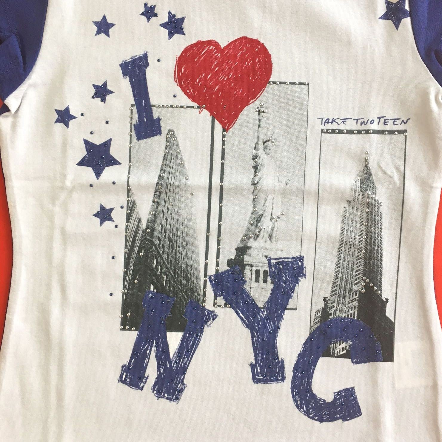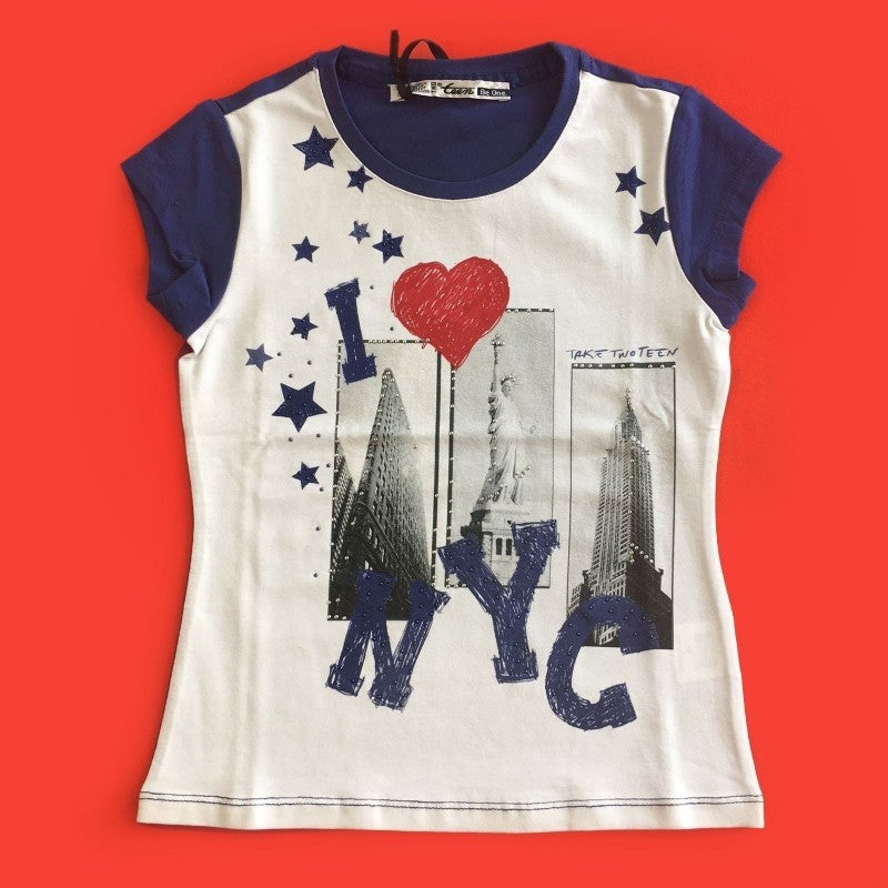 -T-Shirt aus blau-weißer Baumwolle mit Print und Strassapplikationen auf der Vorderseite