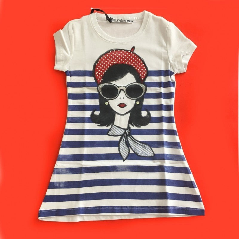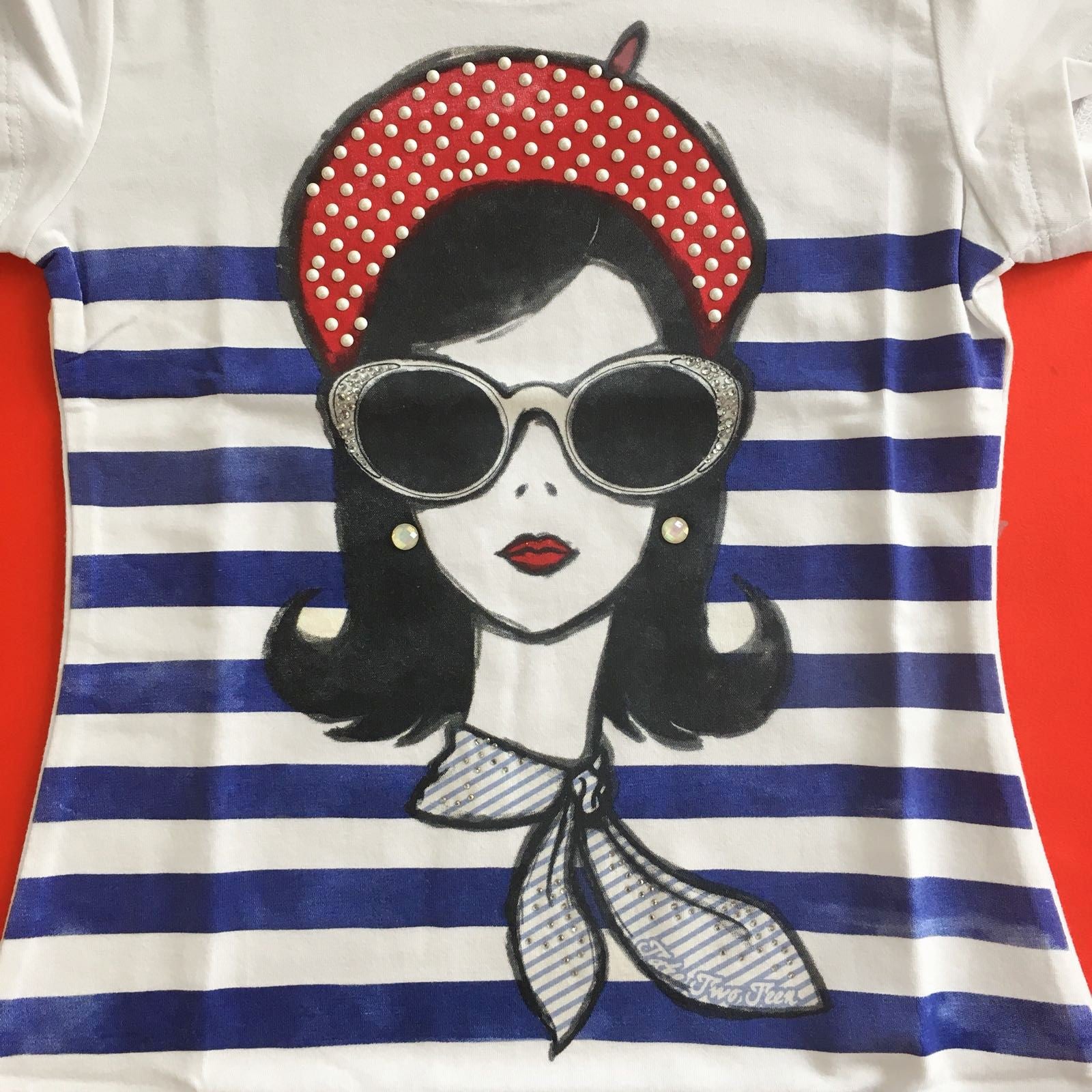 -Langes T-Shirt aus weißer und blauer Baumwolle auf der Vorderseite mit Streifen mit Aufdruck und Applikationen auf der Vorderseite