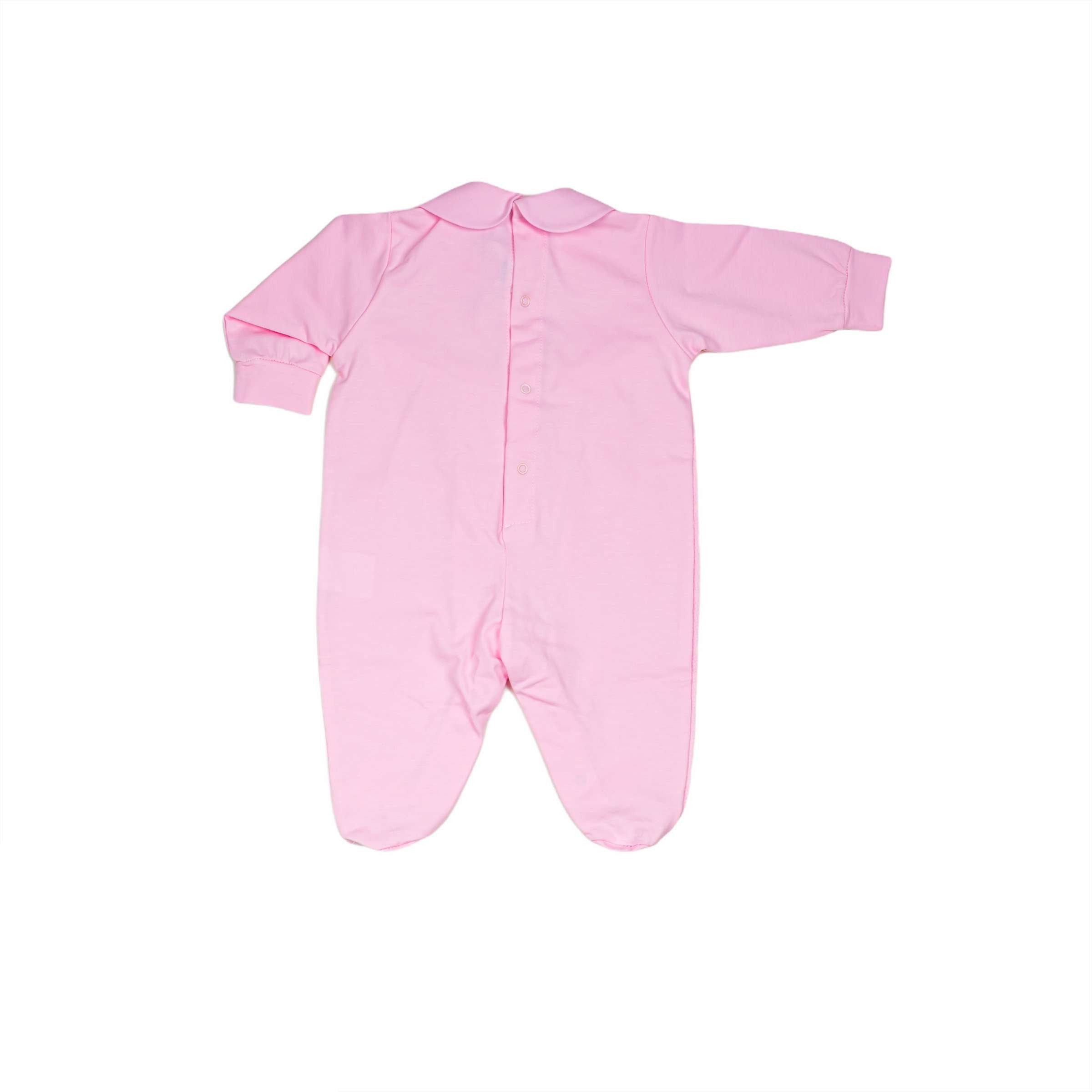 Langärmliger rosafarbener Baumwoll-Strampler mit weiß bestickten Tüll- und Rosenapplikationen.