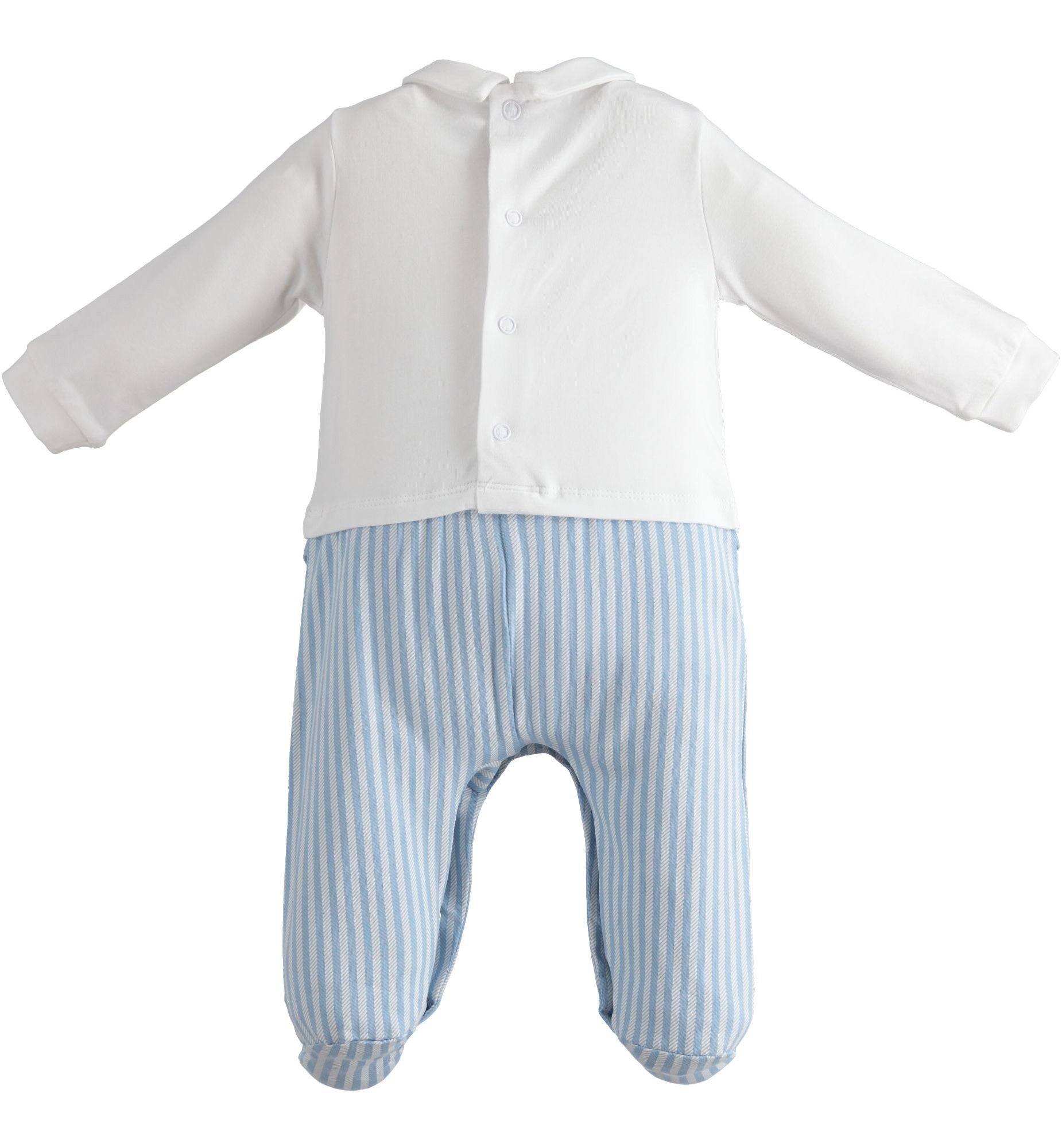 Baumwoll-Strampler mit langen Ärmeln. Weißes Top mit Teddybär-Applikation in der Mitte und weißen und hellblau gestreiften Hosenträgern mit zwei falschen hellblauen Knöpfen. Unten hellblau und weiß gestreift. Mit Füßen