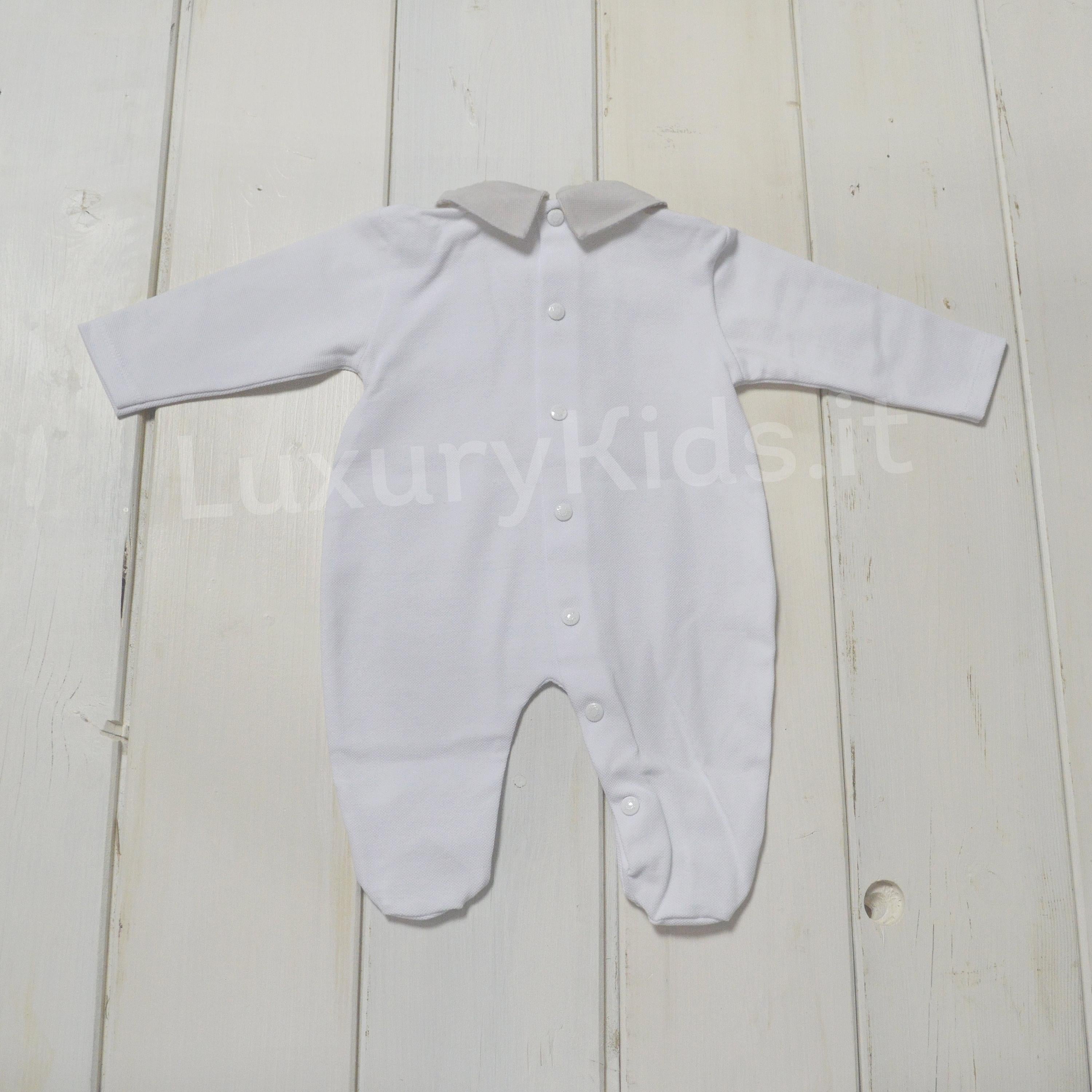 - Ganzkörper-Bodysuit aus Baumwolle mit weißer Teddybär-Stickerei auf der Brust und beige gestreiften Details