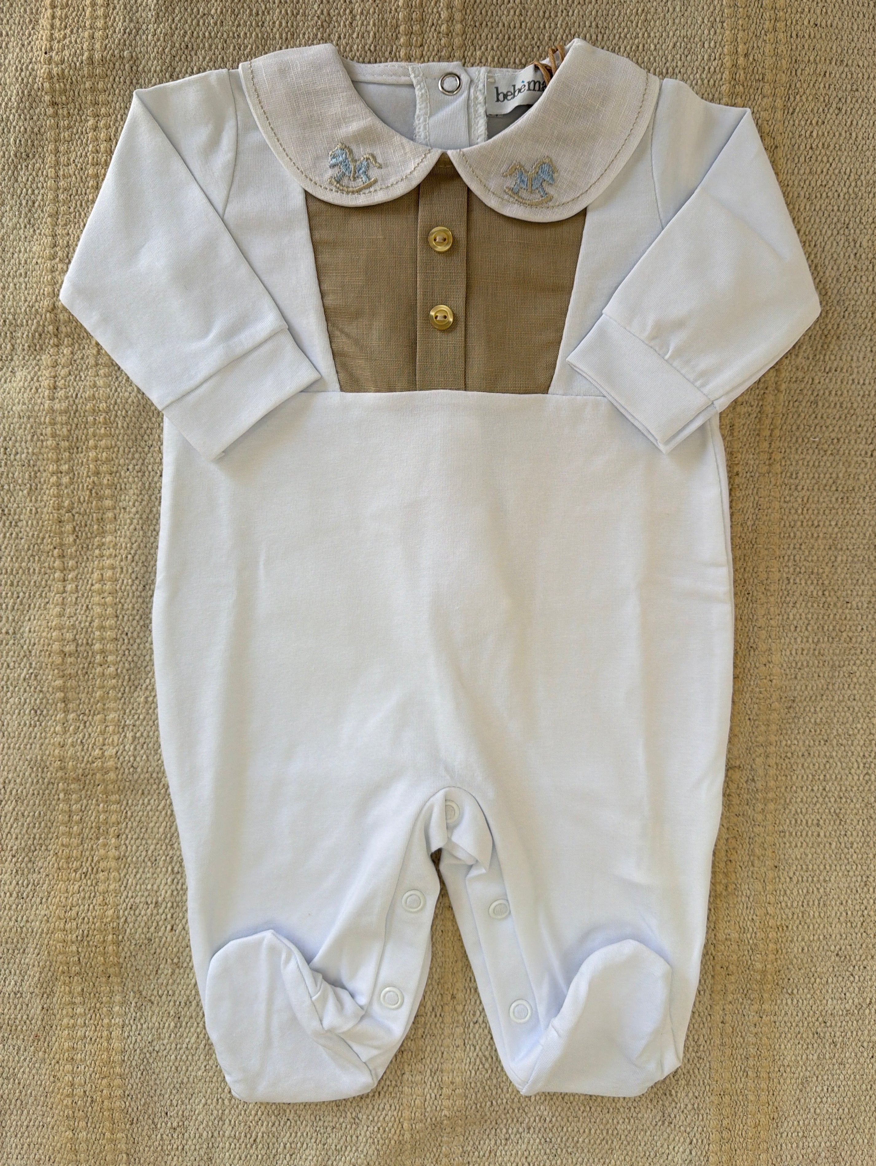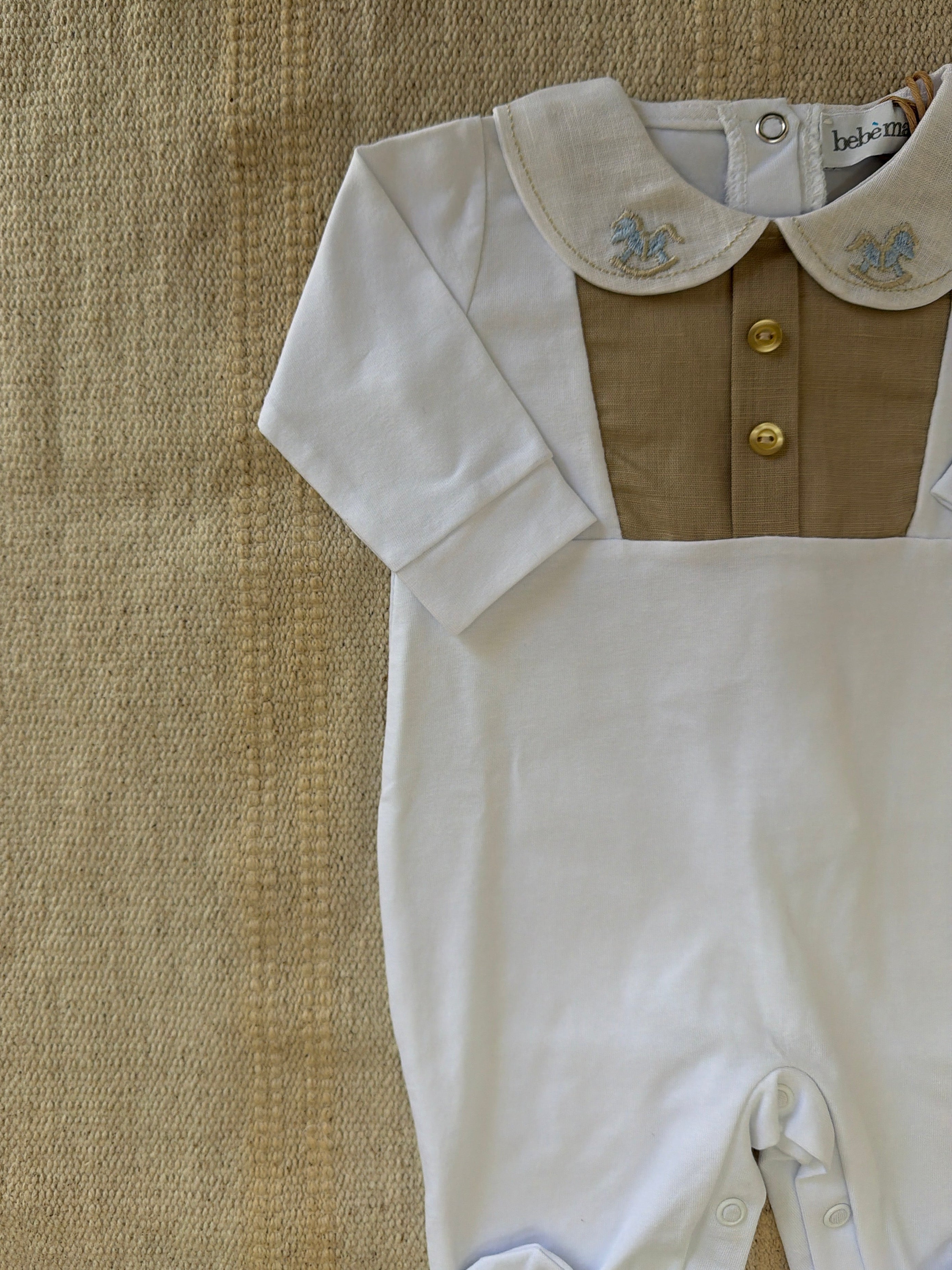 Delicata tutina intera in puro cotone per neonati, caratterizzata da un elegante colletto ricamato con il motivo esclusivo del cavallo a dondolo. Il capo combina comfort e stile, perfetto per le occasioni speciali del vostro bambino. La morbidezza del cotone garantisce una vestibilità delicata sulla pelle sensibile del neonato, mentre il ricamo artigianale aggiunge un tocco di raffinatezza. Pratica da indossare e facile da lavare, questa tutina è un'aggiunta sofisticata al guardaroba del vostro piccolo.