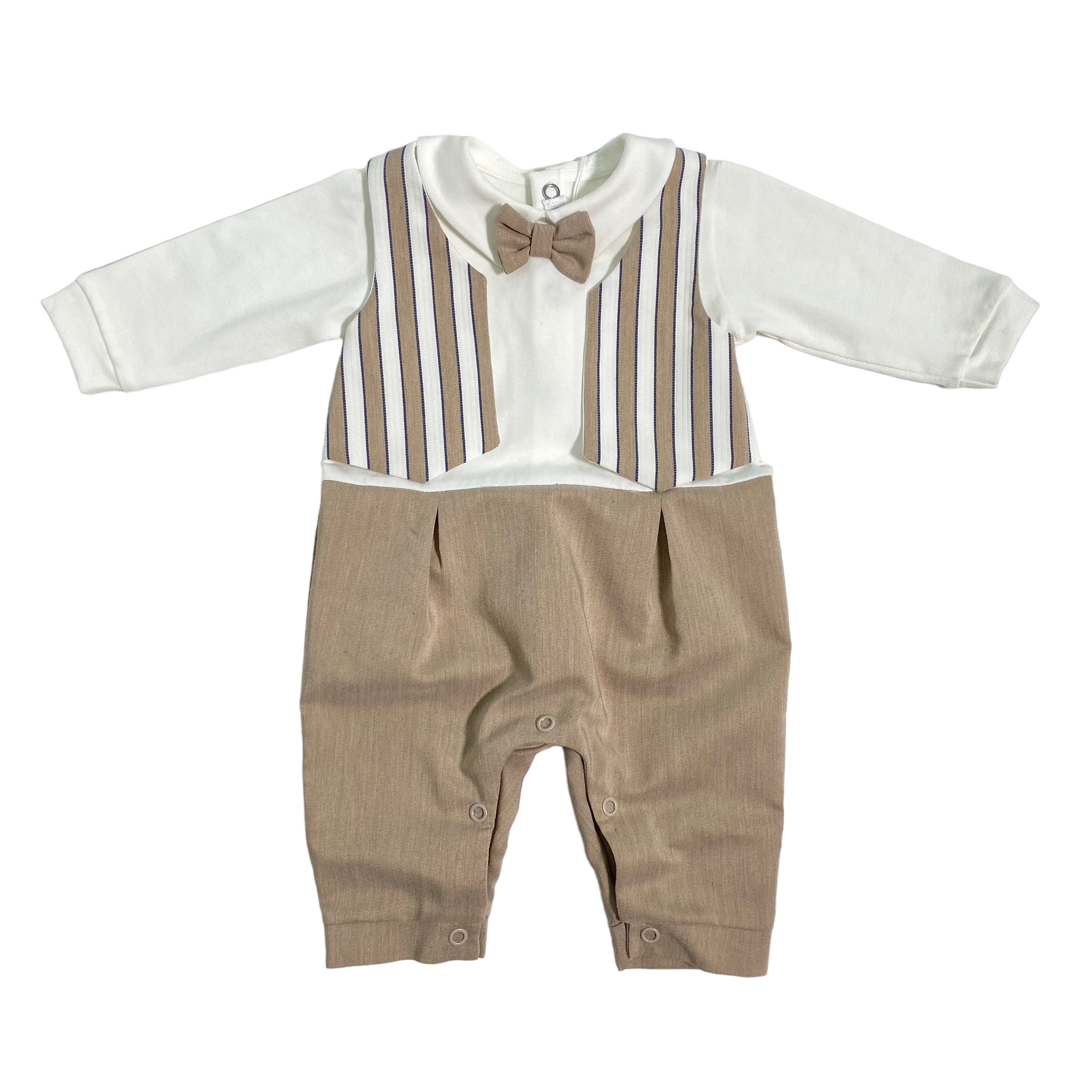 Tutina intera in cotone, con parte sottostante in tinta unita beige e parte superiore panna, con applicazione di finto panciotto e papillon.