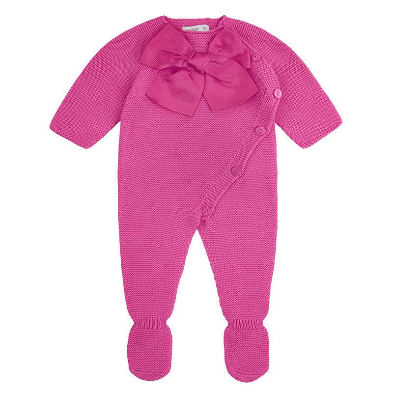 Questa tutina intera in filo di cotone è perfetta per la tua neonata. Grazie al suo morbido tessuto e al punto legaccio con piedino, il tuo bambino sarà sempre al caldo e comodo. L'apertura con bottoni sul fianco rende il cambio facile e veloce, mentre il grande fiocco in gros grain sul petto aggiunge un tocco di stile e dolcezza.