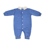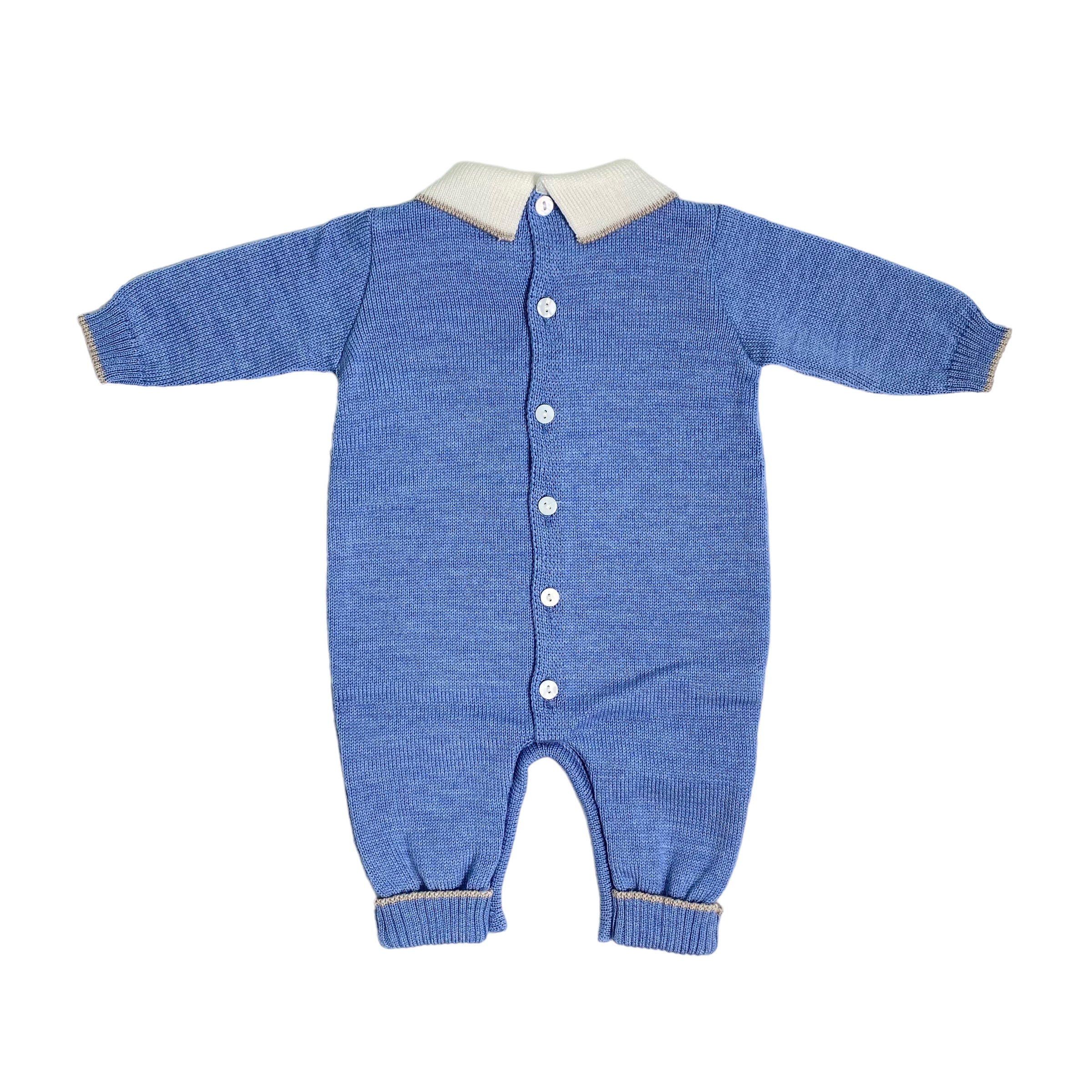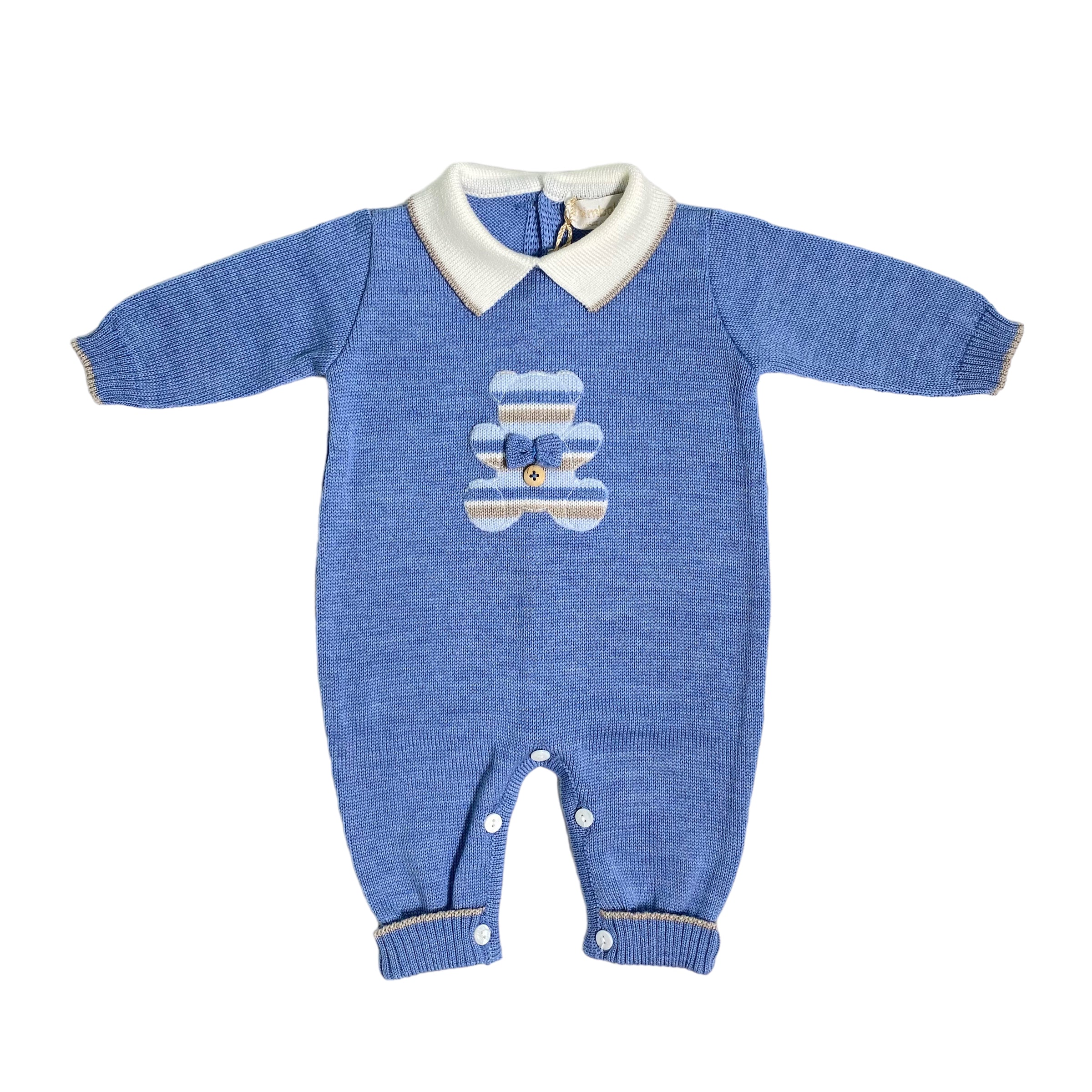 Einteiliger Playsuit aus 100 % reiner Wolle, in schlichtem Blau, mit Teddybär.