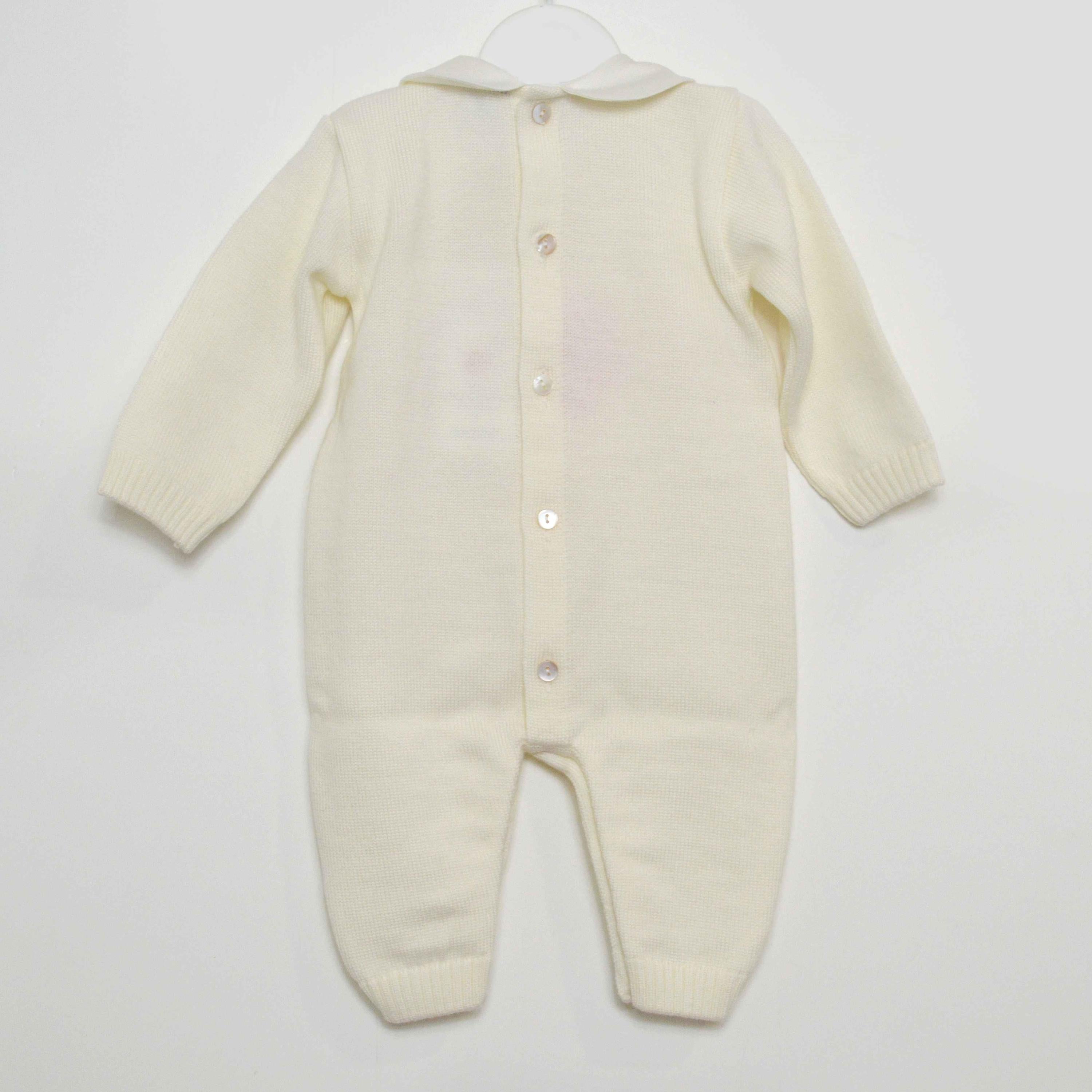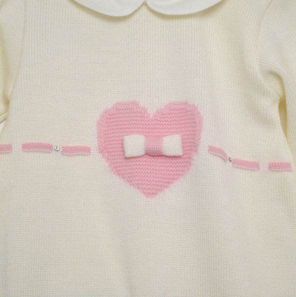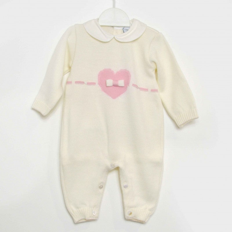 Ganzer Anzug aus cremefarbener Wolle mit rosa Herzstickerei.