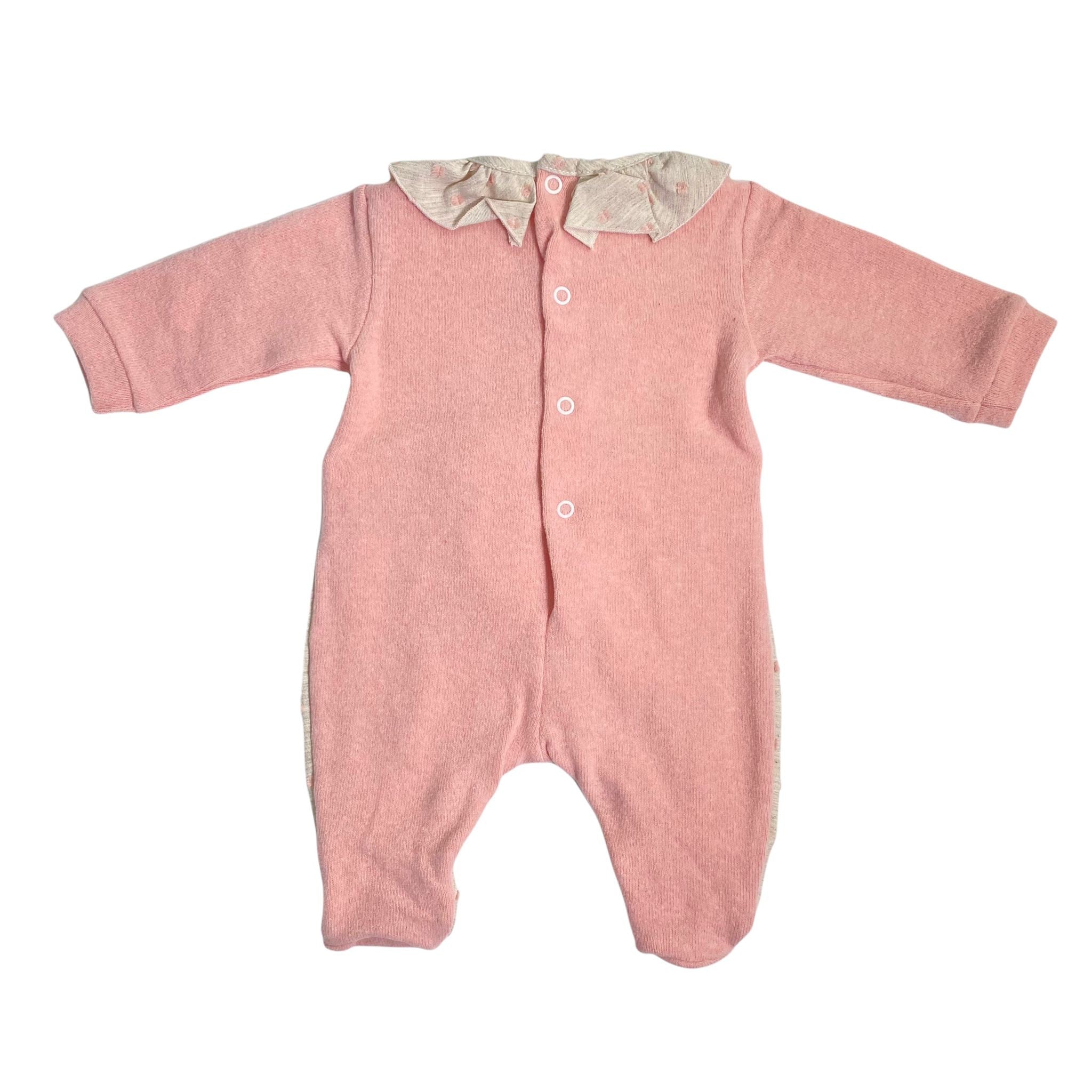 Einteiliger Overall mit Füßen und langen Ärmeln, Oberteil aus rosafarbener Wolle mit Steuerrad, Unterteil in Beige mit erhabenem Punktmuster, Verschluss und Öffnung am Ende und auf der Rückseite mit Druckknöpfen.