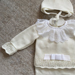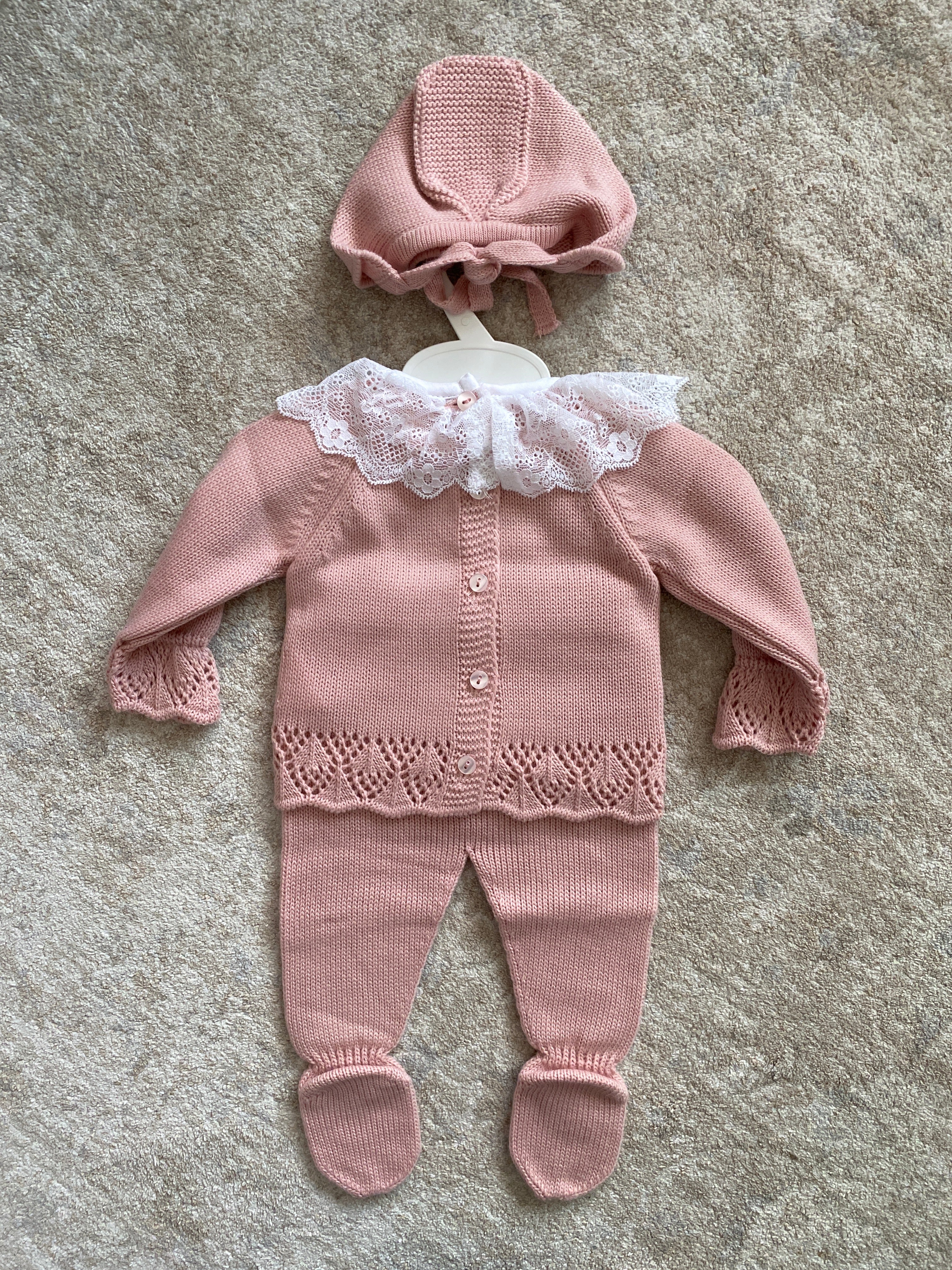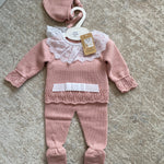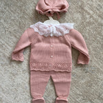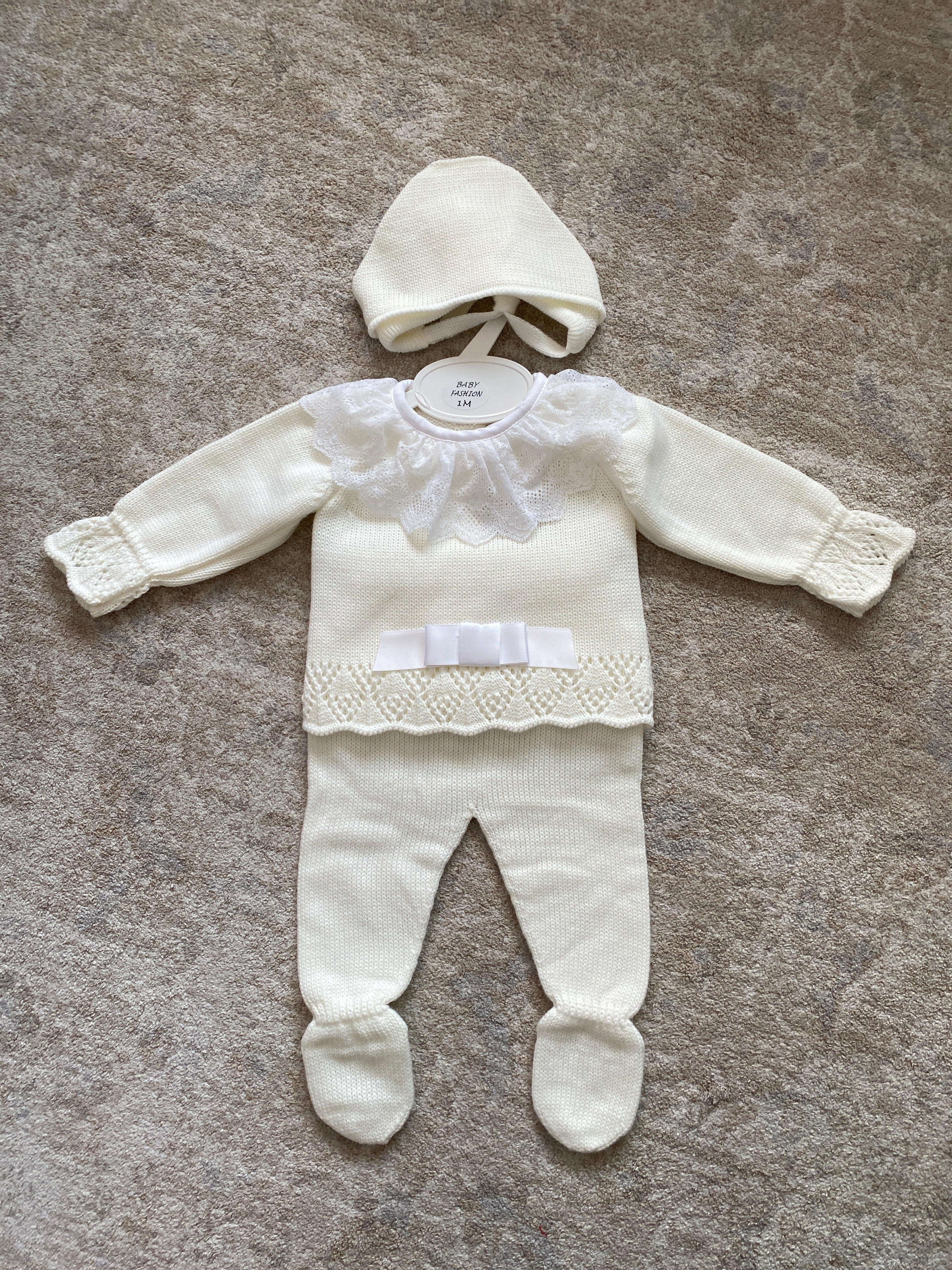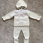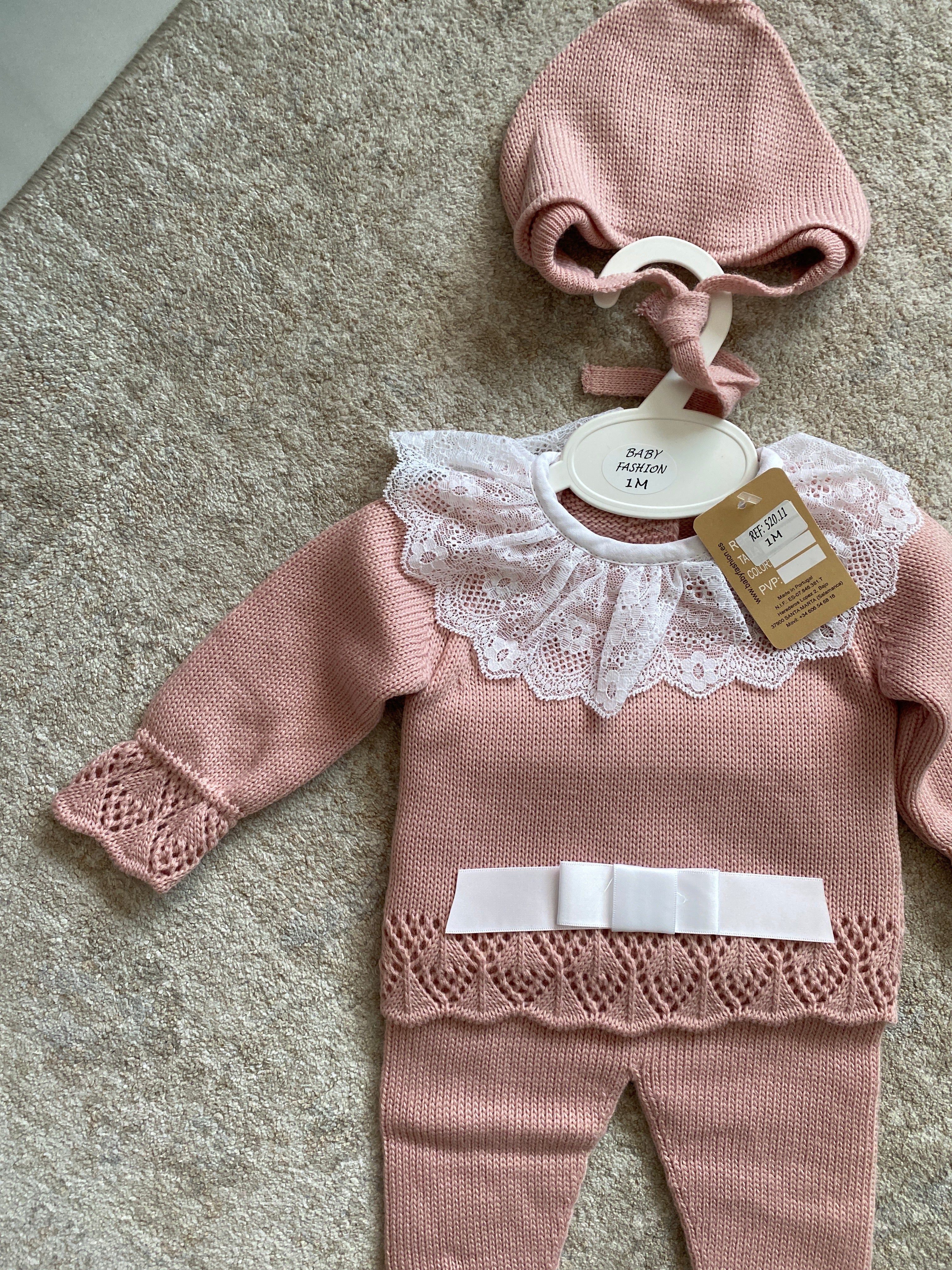 Questa tutina spezzata invernale per neonata è realizzata in morbido tessuto, ideale per garantire comfort e calore durante i mesi freddi. Il colletto tondo in pizzo aggiunge un tocco elegante, mentre il fiocco sul davanti dona delicatezza al capo. Completa di cuffia coordinata, questa combinazione pratica è perfetta come corredino per accudire la tua piccola con stile e cura.