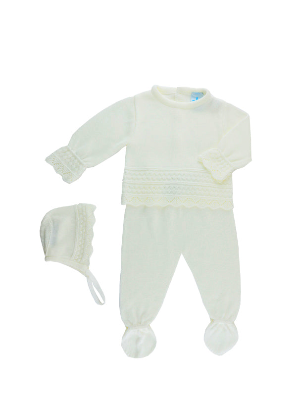 Questa tutina spezzata con cuffietta è perfetta per il tuo neonato. Realizzata con trama lavorata e girocollo, garantisce un'uscita clinica elegante e neutra, ideale per ogni genere. Rivela il genere del tuo bambino con stile e comfort.