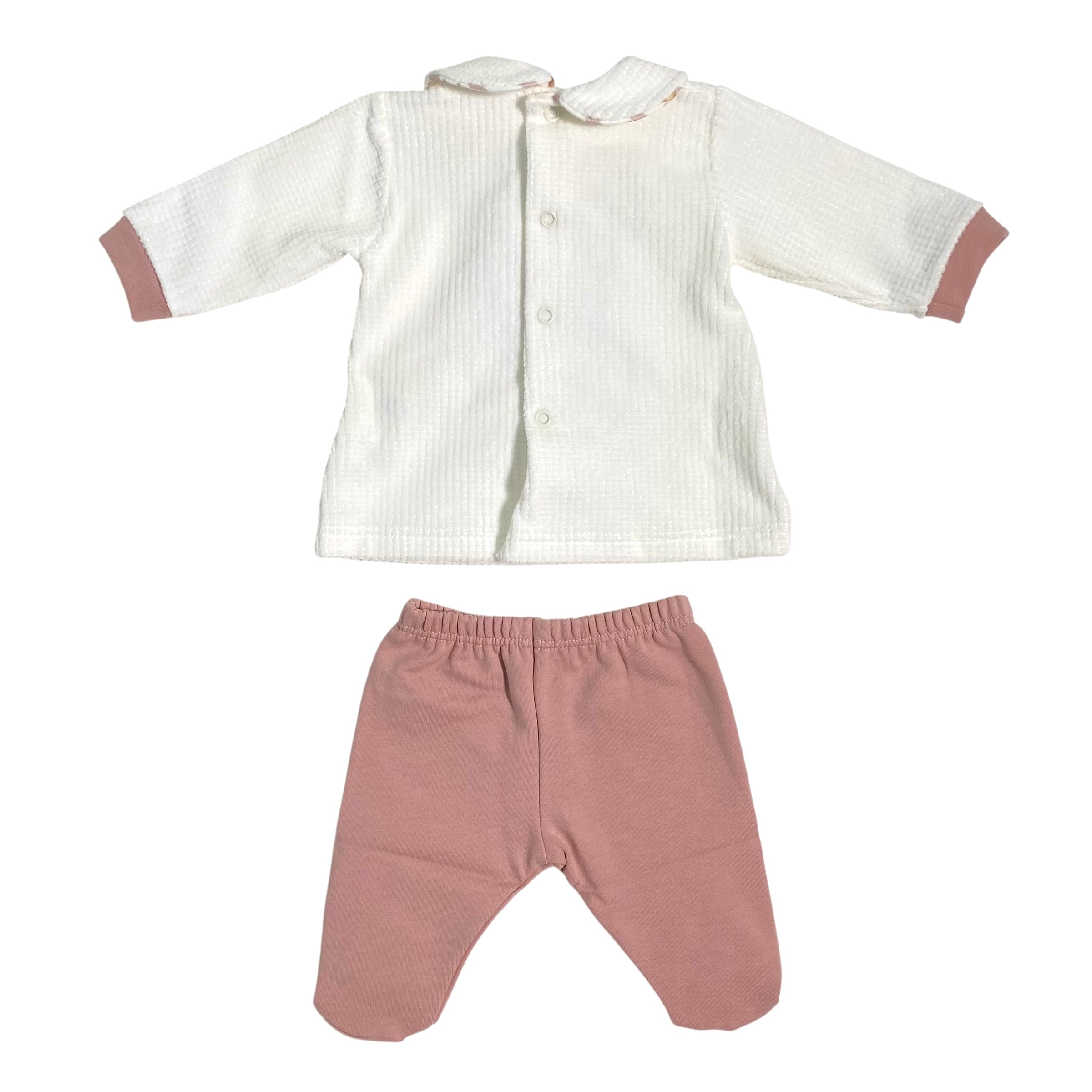 Questa tutina spezzata in ciniglia presenta un morbido orso ricamato e include una maglia in ciniglia abbinata, oltre a una ghettina in caldo cotone, ideale per le prime uscite in clinica. Il completo offre comfort e calore, garantendo eleganza e praticità per la neonato fin dai primi giorni. Perfetto come corredino raffinato e funzionale.
