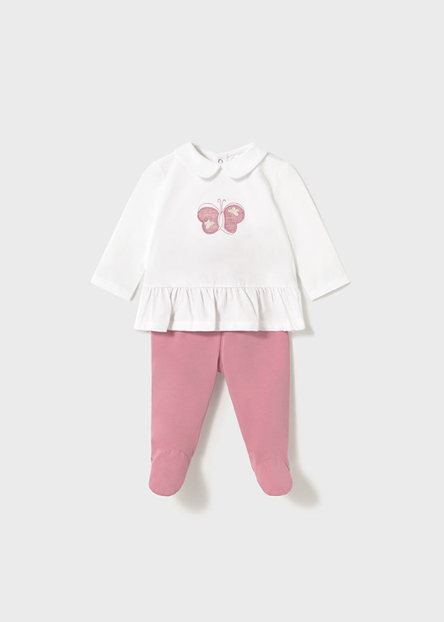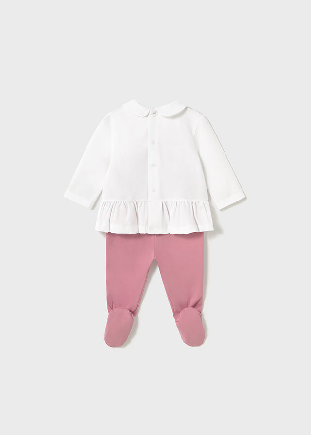 Questo completo per neonato è costituito da maglietta manica lunga con ghettina abbinata.