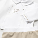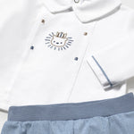 Maglietta manica lunga per neonato. Colletto modello camicia. Chiusura con bottoni sulla schiena per facilitare la vestibilità del capo. Elementi decorativi: ricamo.