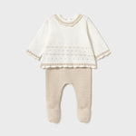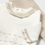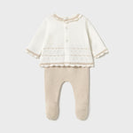 Questo completo in tricot di due pezzi per neonato è costituito da maglioncino e ghettina abbinata.