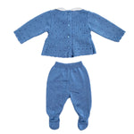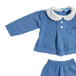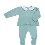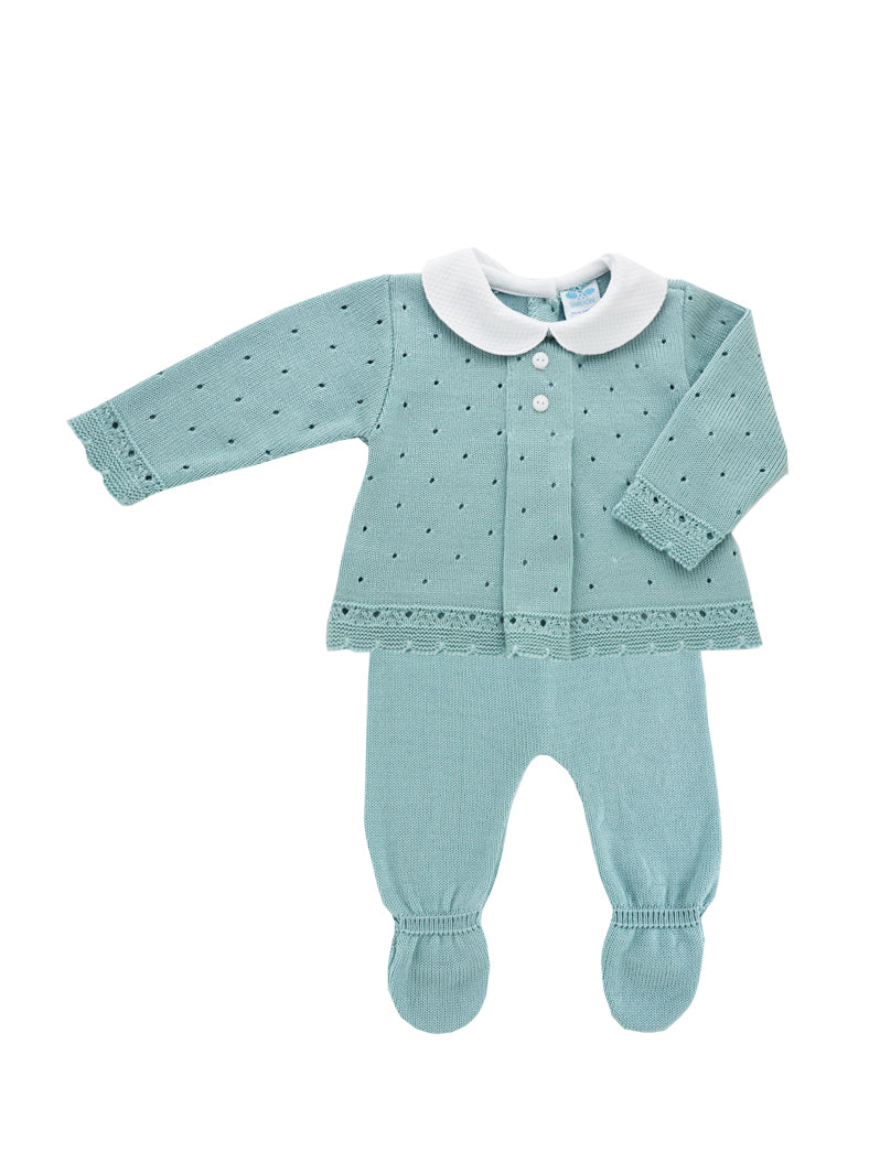 La tutina spezzata è realizzata in tessuto anallergico di alta qualità. Perfetta per l'uscita in clinica, grazie alla sua trama lavorata traforata e il collo bianco in piquet, arricchito da bottoncini bianchi sul petto, sarà sicuramente un'opzione elegante per il tuo bambino.