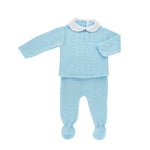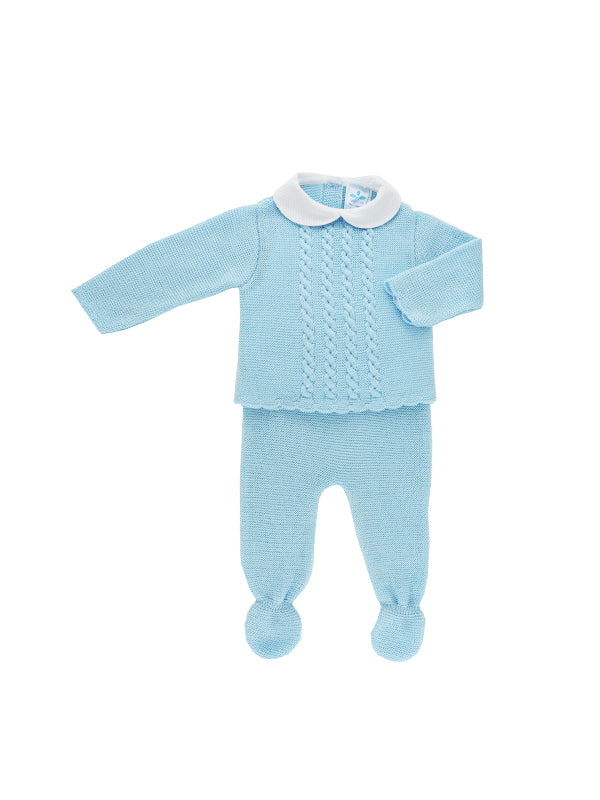 La tutina spezzata è realizzata in tessuto anallergico di alta qualità. Perfetta per l'uscita in clinica, grazie alla sua trama lavorata con trecce e il collo bianco in piquet, sarà sicuramente un'opzione elegante per il tuo bambino.