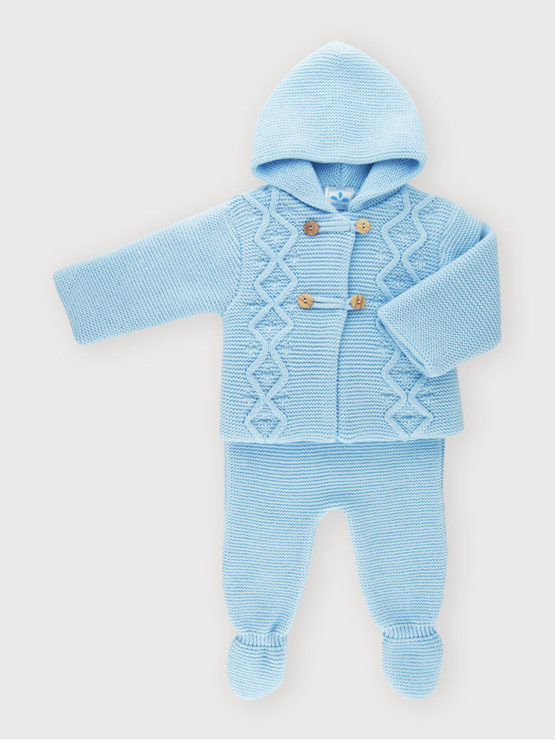 Overall aus hypoallergenem Acrylgewebe, bestehend aus Gamaschen und Doppelmantel mit Kapuze und Verschluss mit Holzknöpfen.