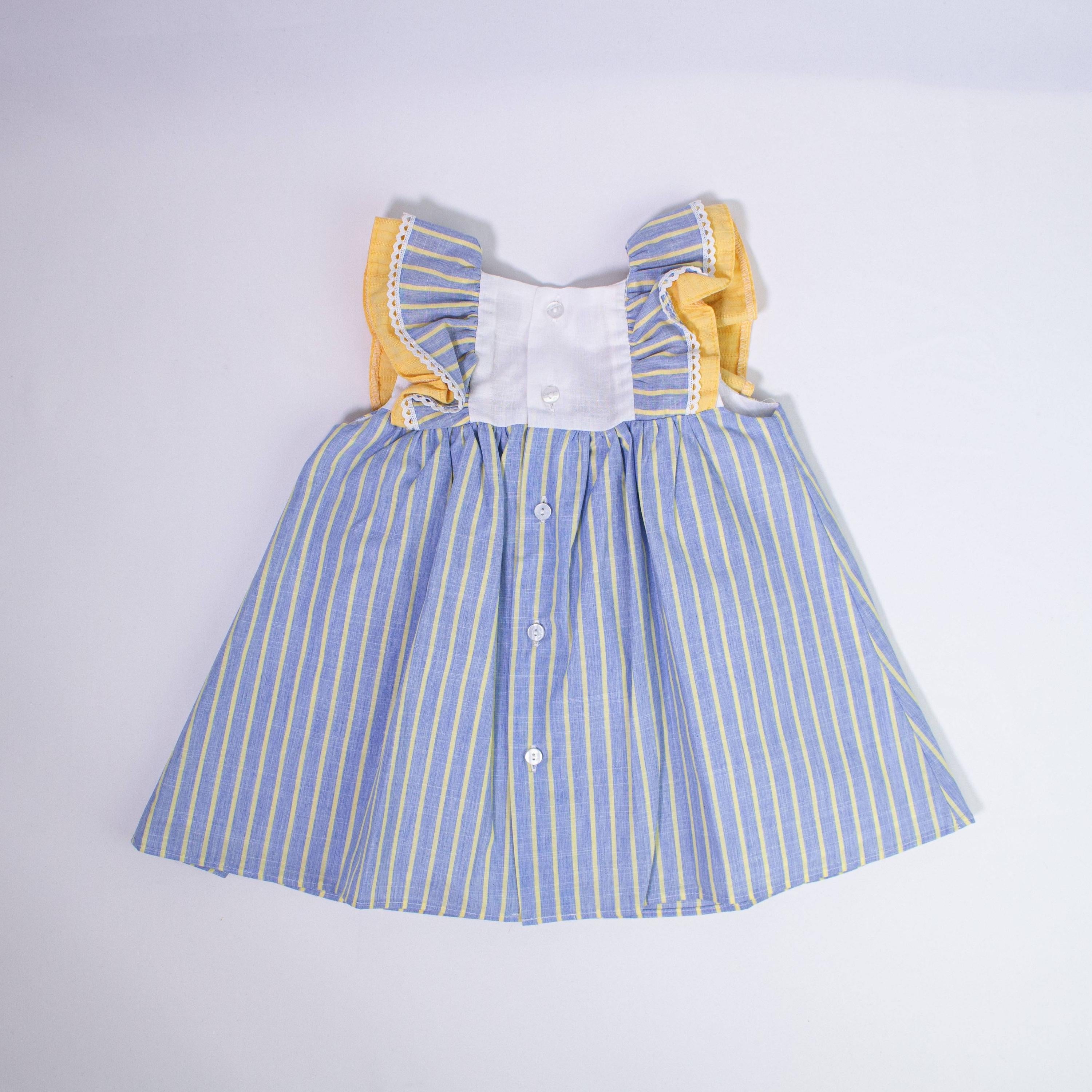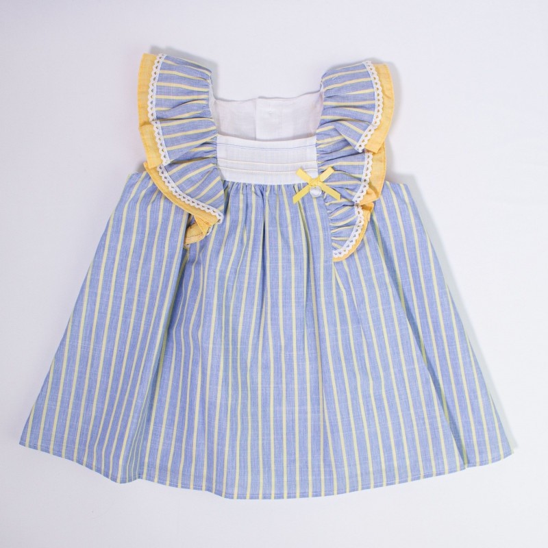 Hellblau-gelb gestreiftes Baumwollkleid mit gerüschten Ärmeln und weißer Spitze.