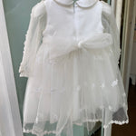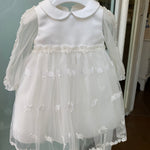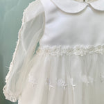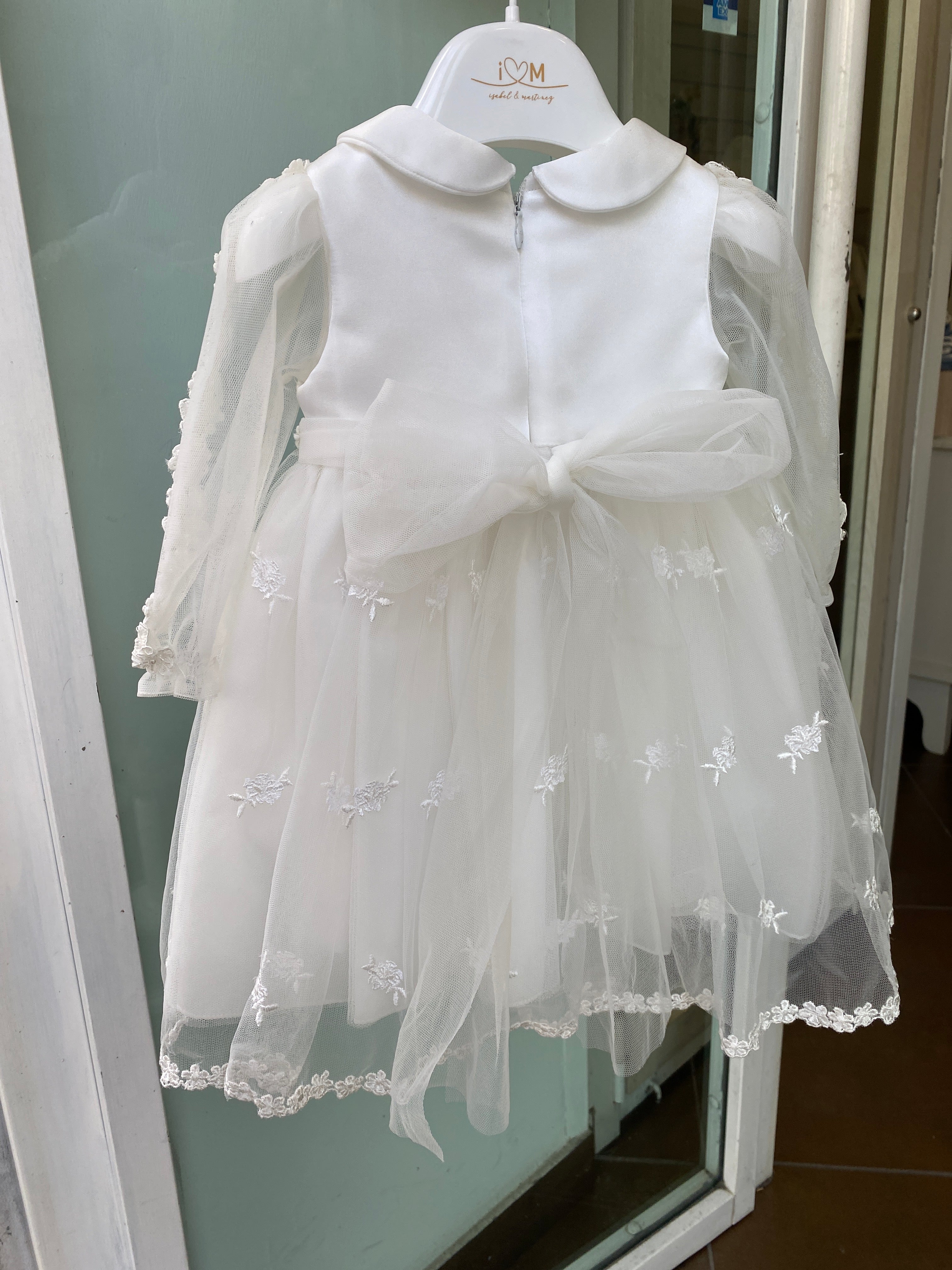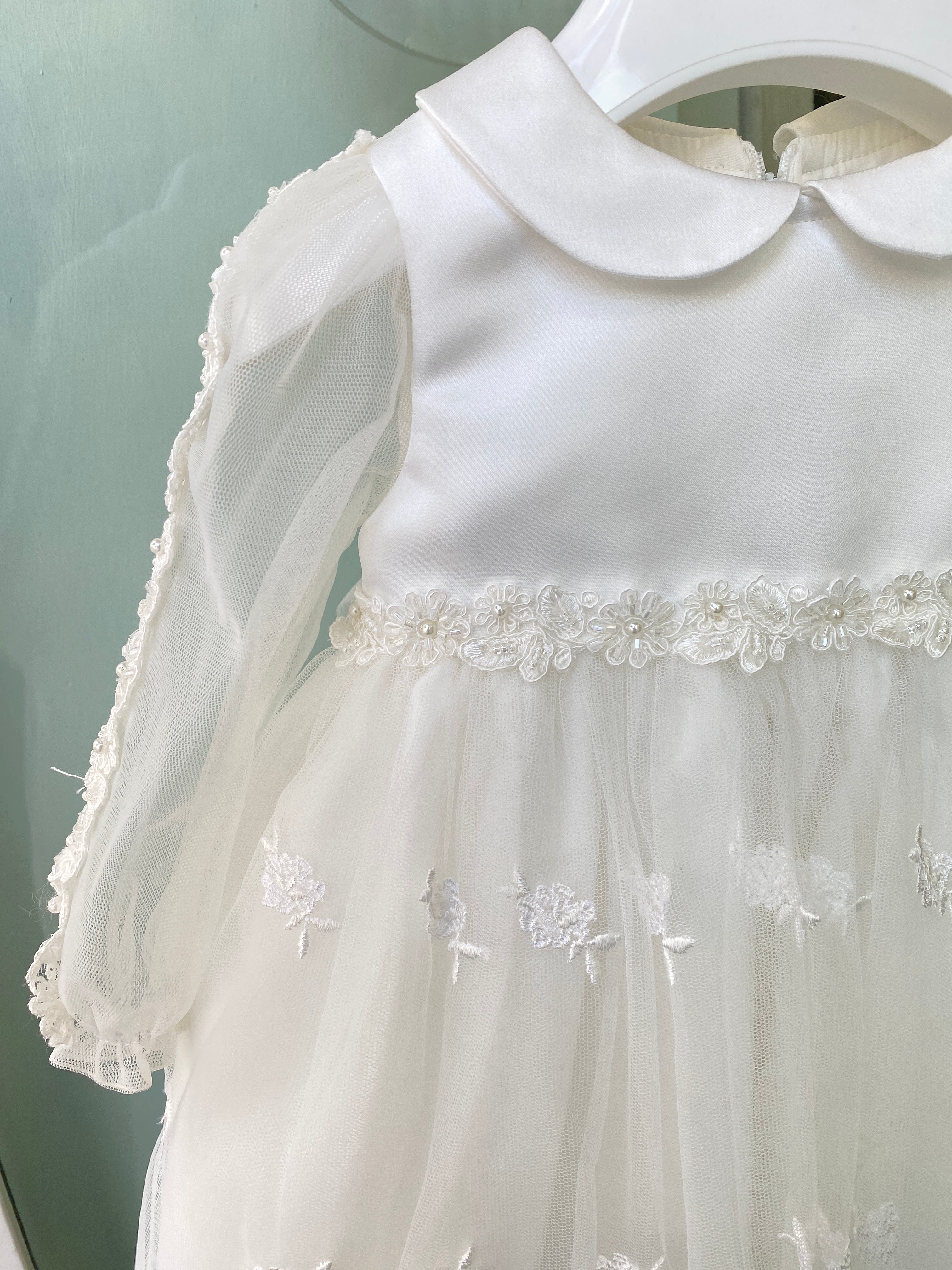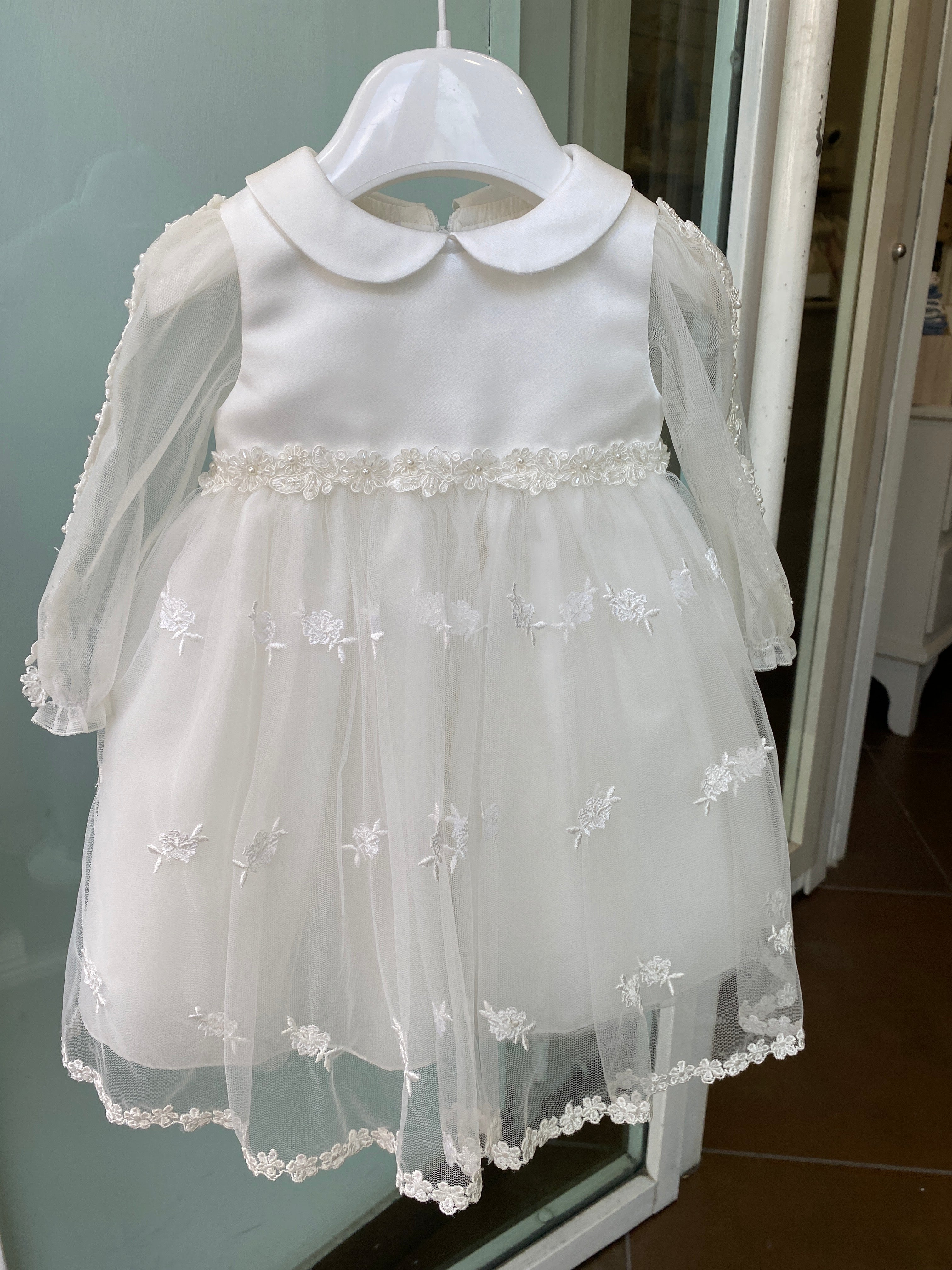 Abito battesimale con corpetto in raso e collo tondo, maniche in velo ricamate, gonna in tulle ricamata.