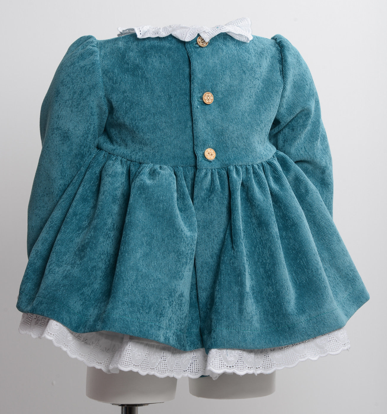 Abito maniche lunghe in velluto con culotte con merletto al girocollo e chiusura posteriore con bottoni.
