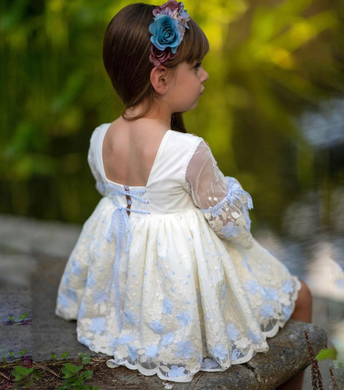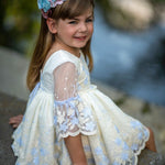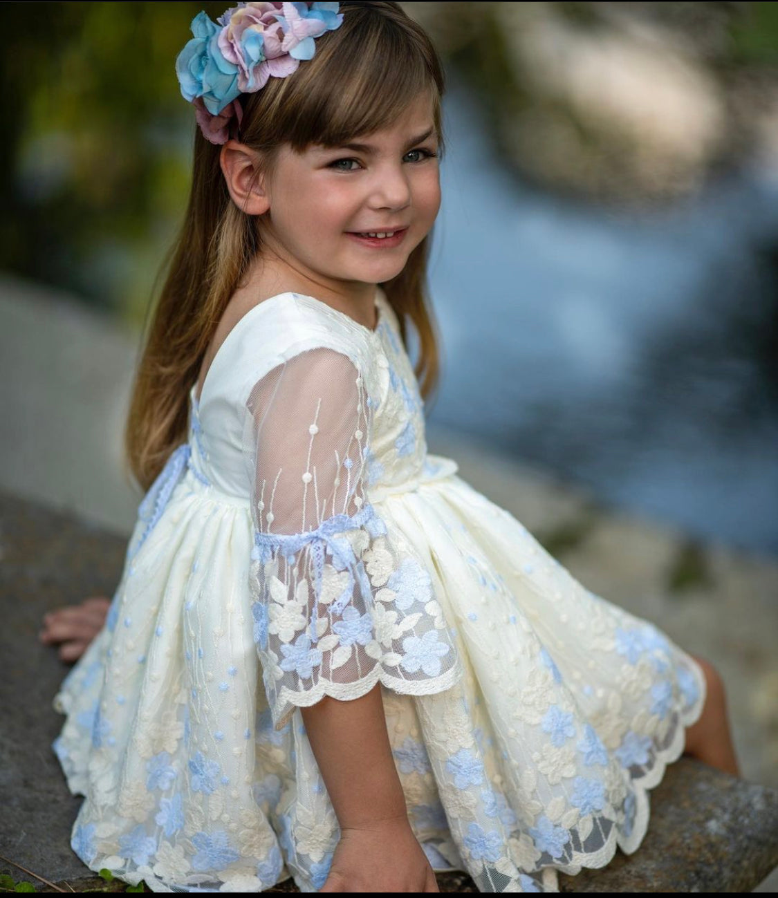 Tutto l'abito è ricoperto da pizzo color panna con dei bellissimi ricami di fiori e palline panna e celeste. La parte superiore ha un bellissimo scollo quadrato con la parte della manica tutta in pizzo trasparente con lo stesso ricamo e con un semplicissimo nastrino in filo con un fiocco celeste. Sul retro è presente l'apertura a zip invisibile e con l'aggiunta di un nastrino in filo per poter regolare al meglio il vostro vestito.