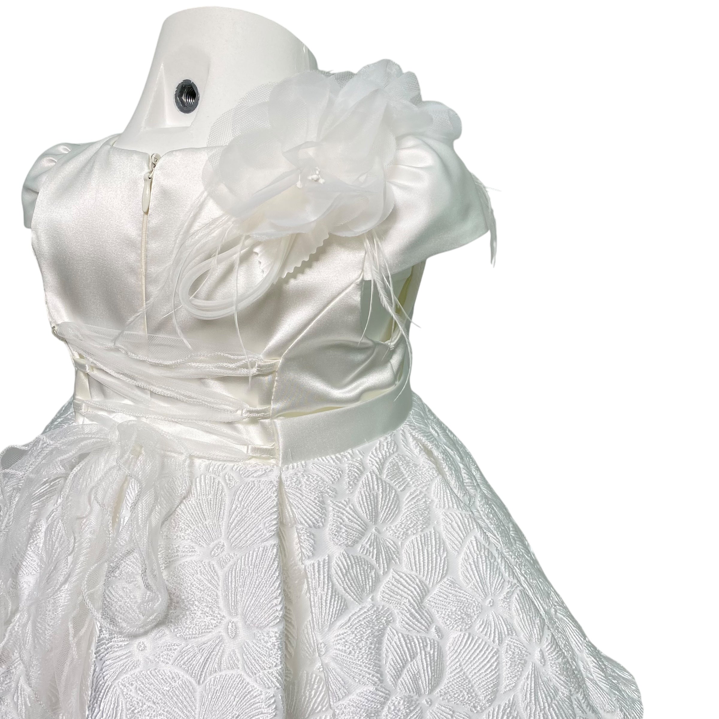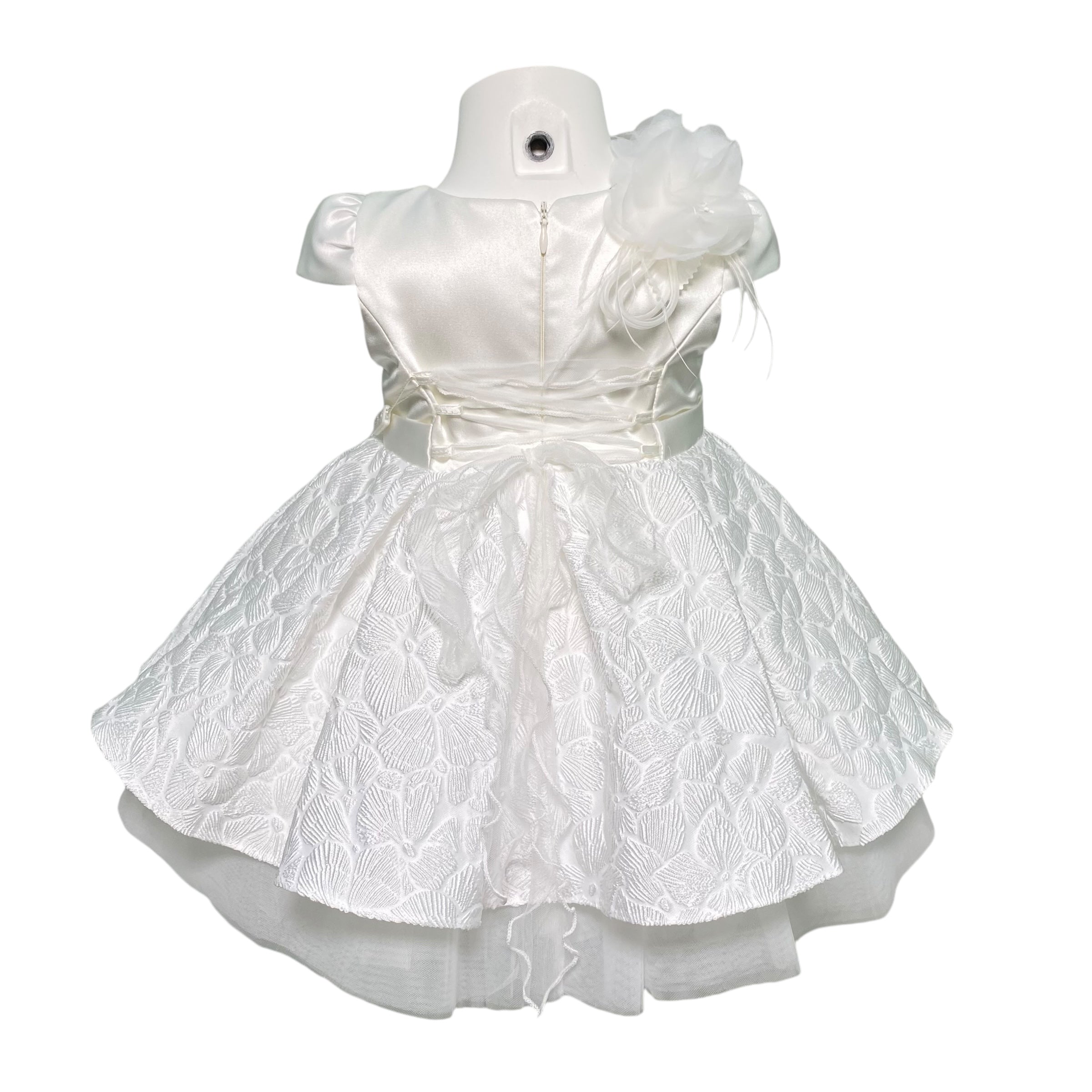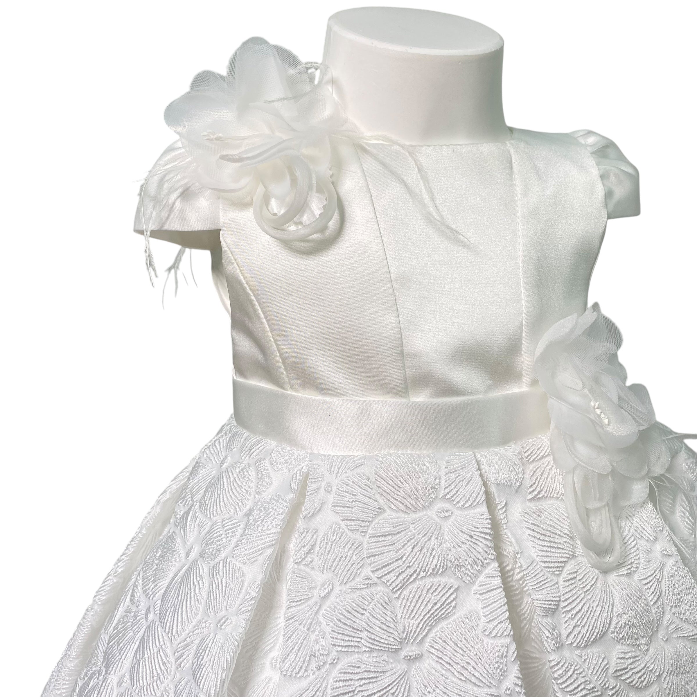 Realizzato con un corpetto in raso e una gonna lavorata in tulle per un effetto ampliato. Un fiore delicato sulla spalla aggiunge un tocco di eleganza. Prodotto in Italia con materiali di alta qualità per un'esperienza di battesimo importante.