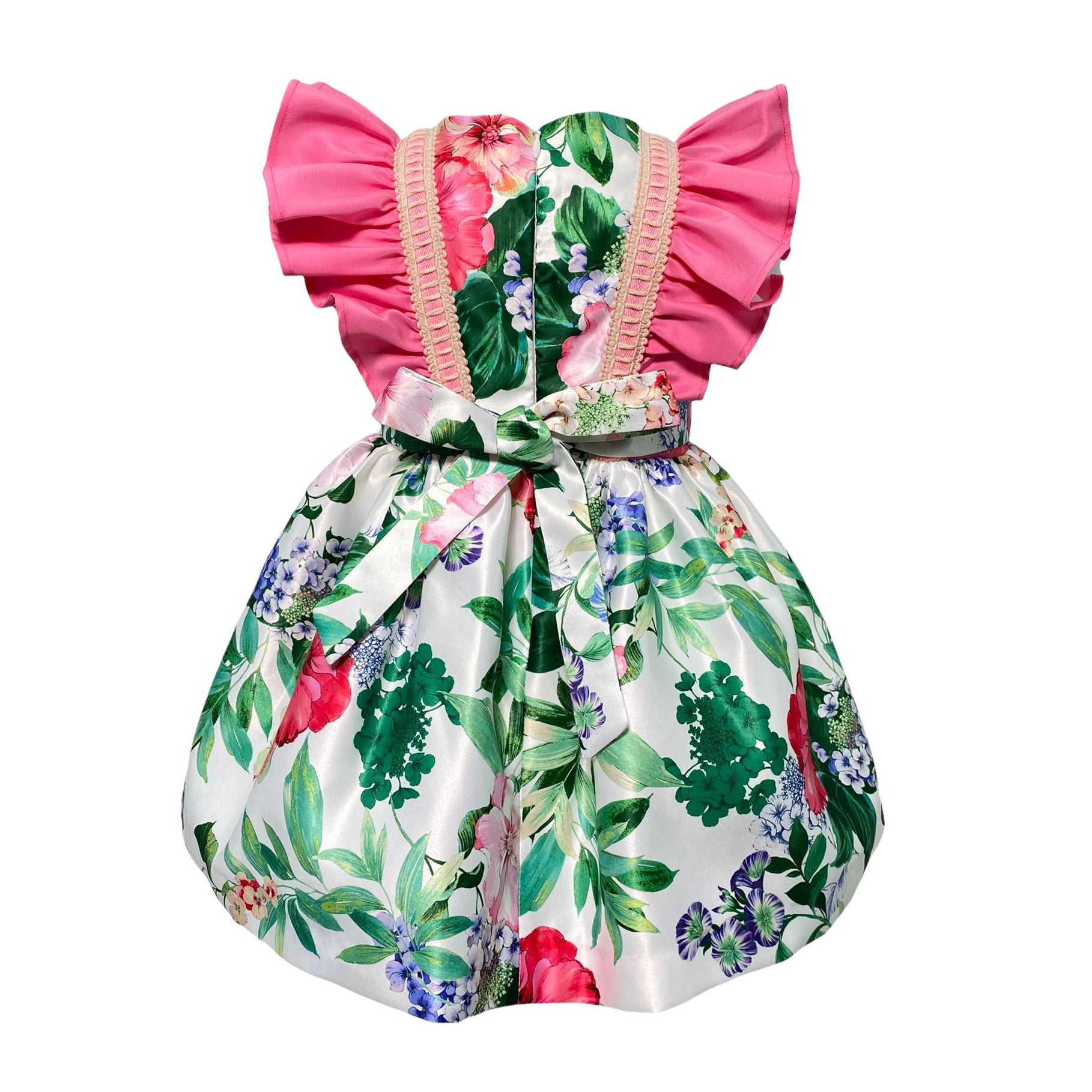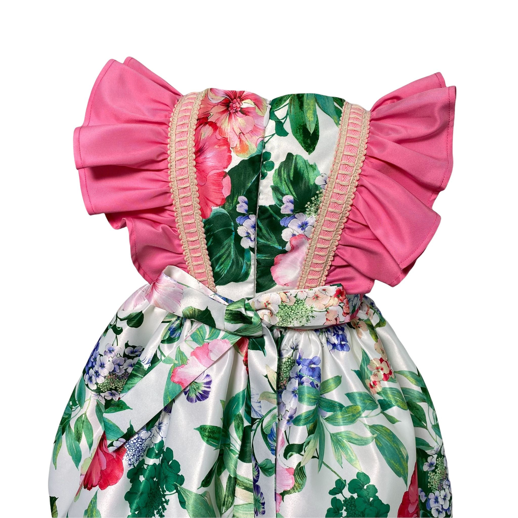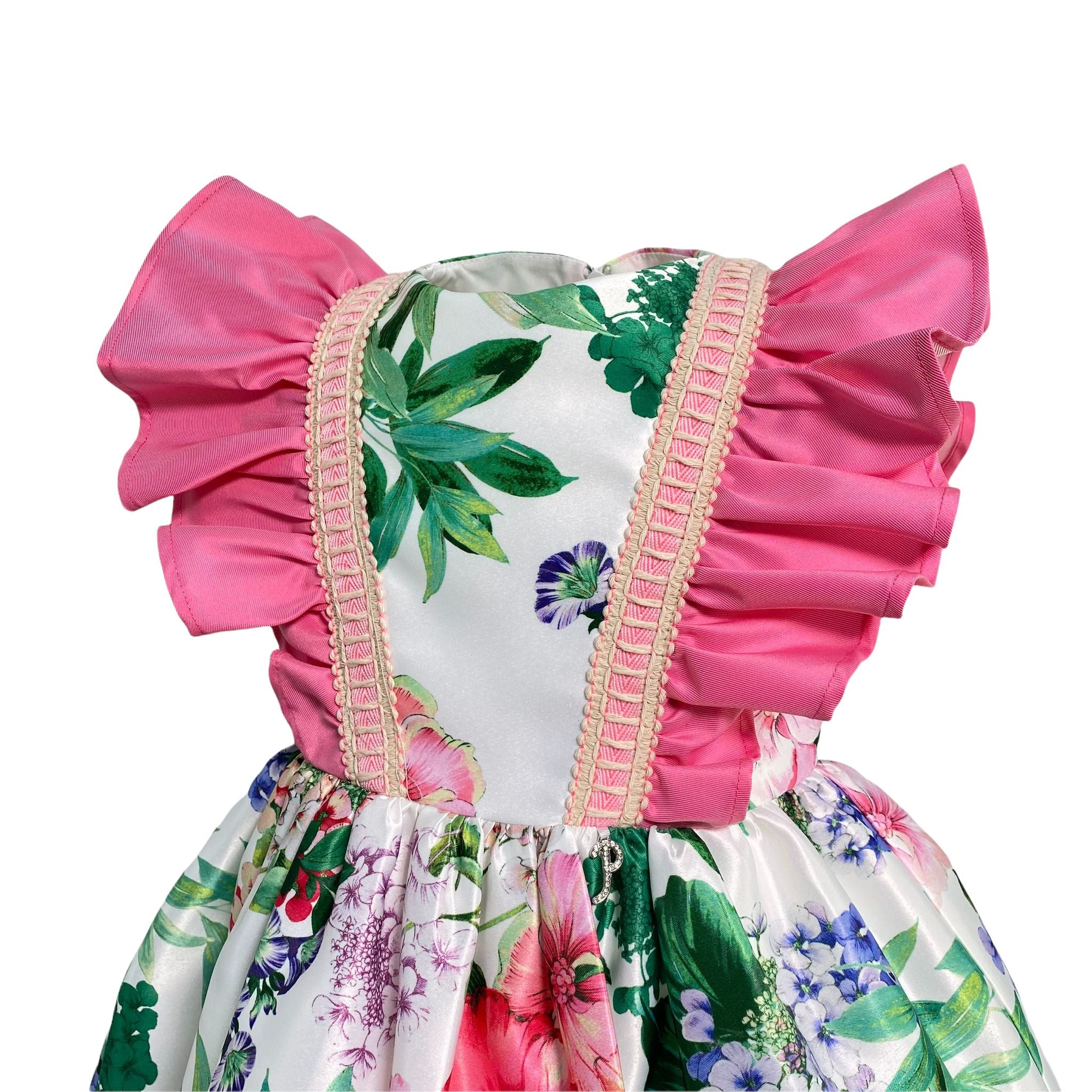 Abito elegante smanicato fantasia florale arricchito da rouches fuxia sulle spalle.