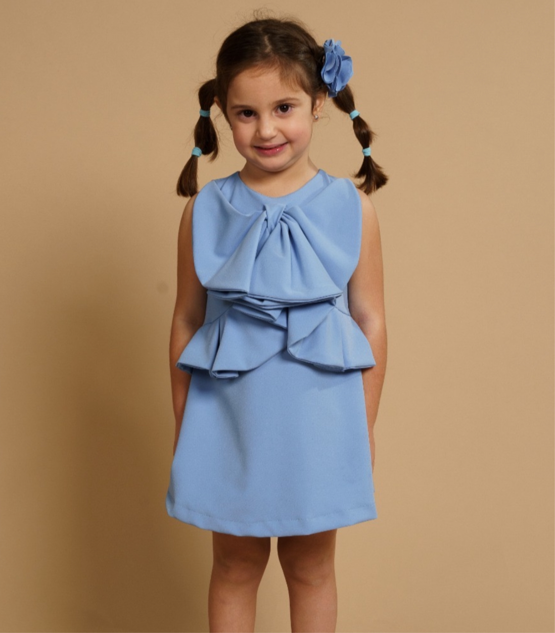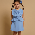 Ricercato abito elegante smanicato con fiocco sul davanti e rouches in vita. Perfetto per ogni occasione, sia elegante che casual. Aggiungi un tocco unico e di stile al guardaroba della tua bambina.