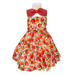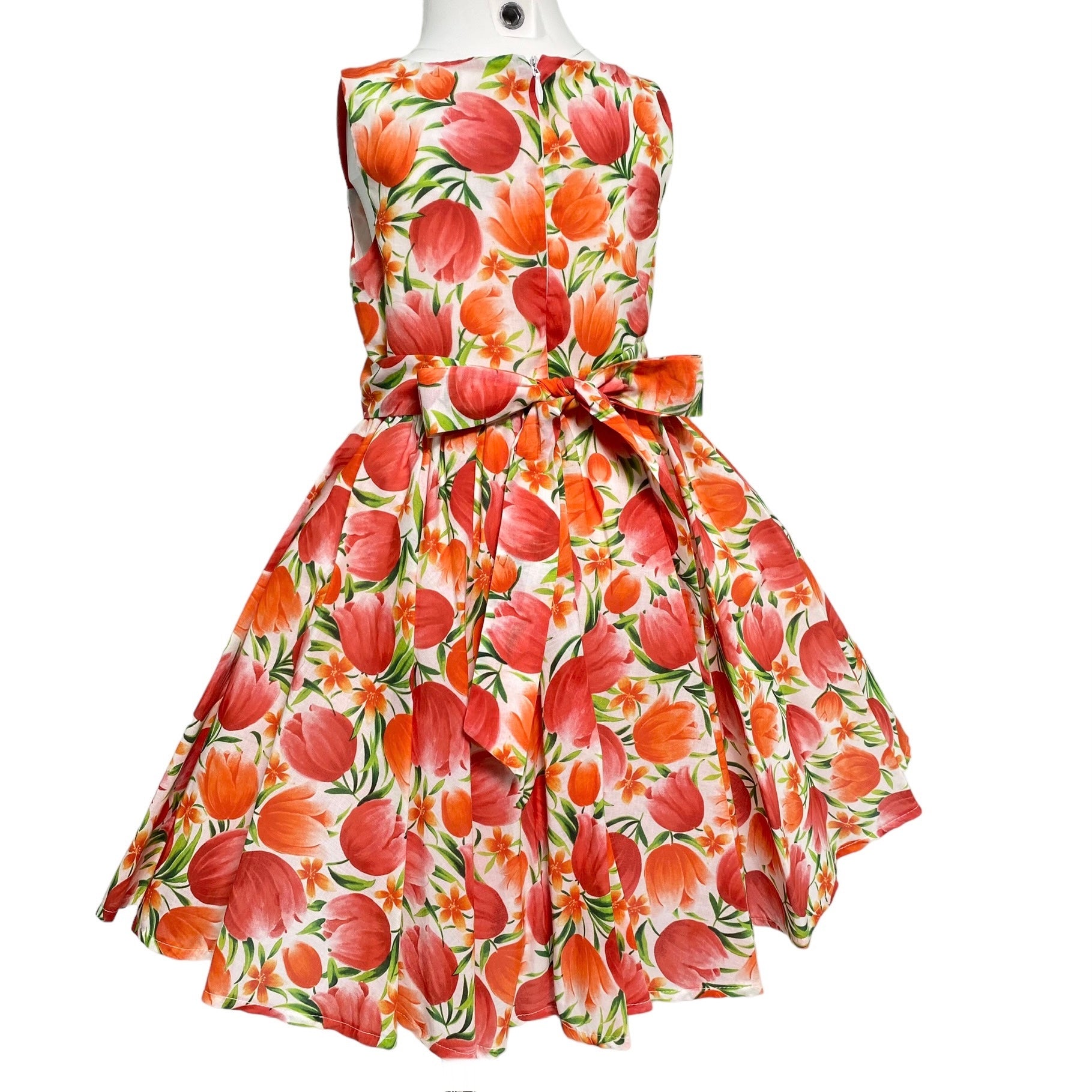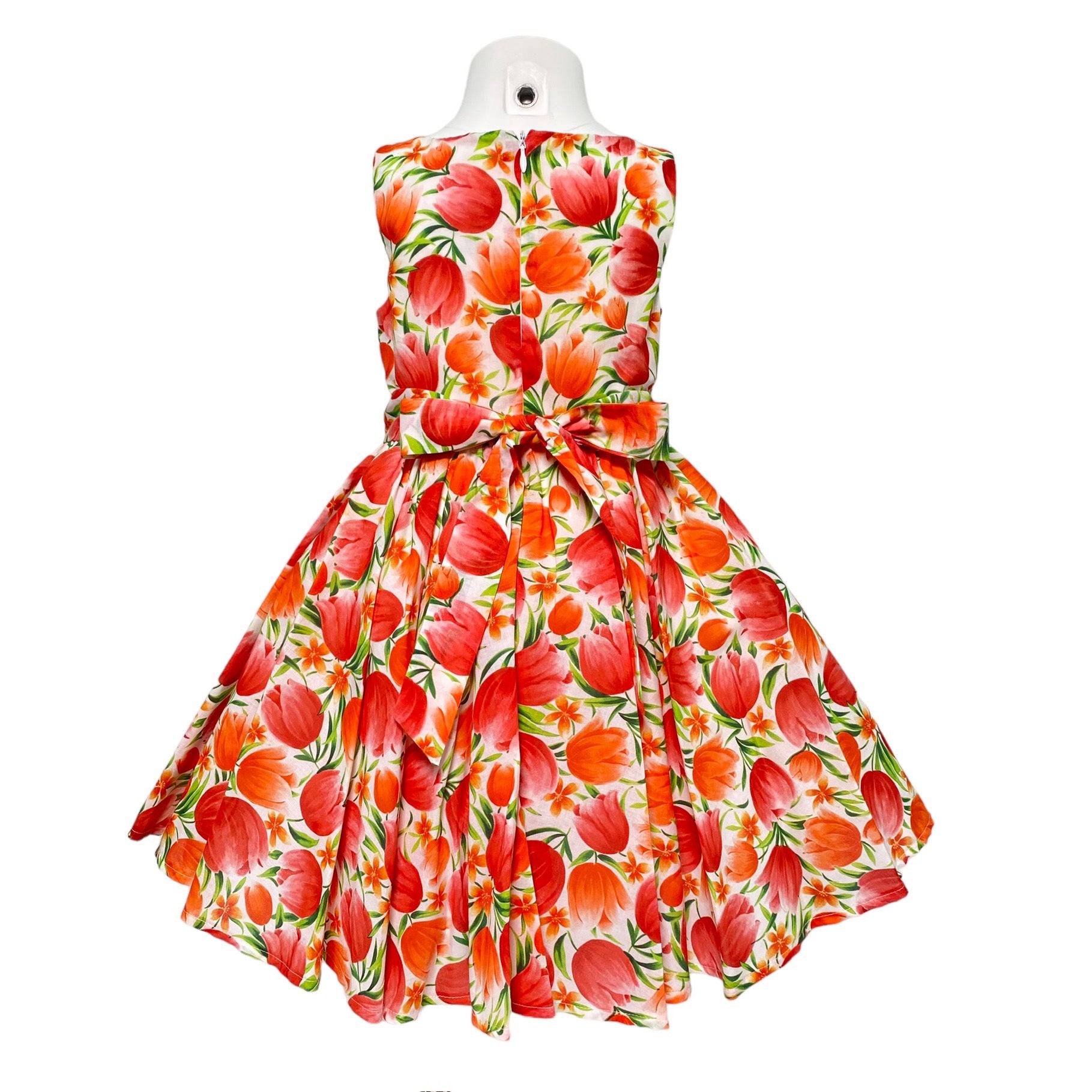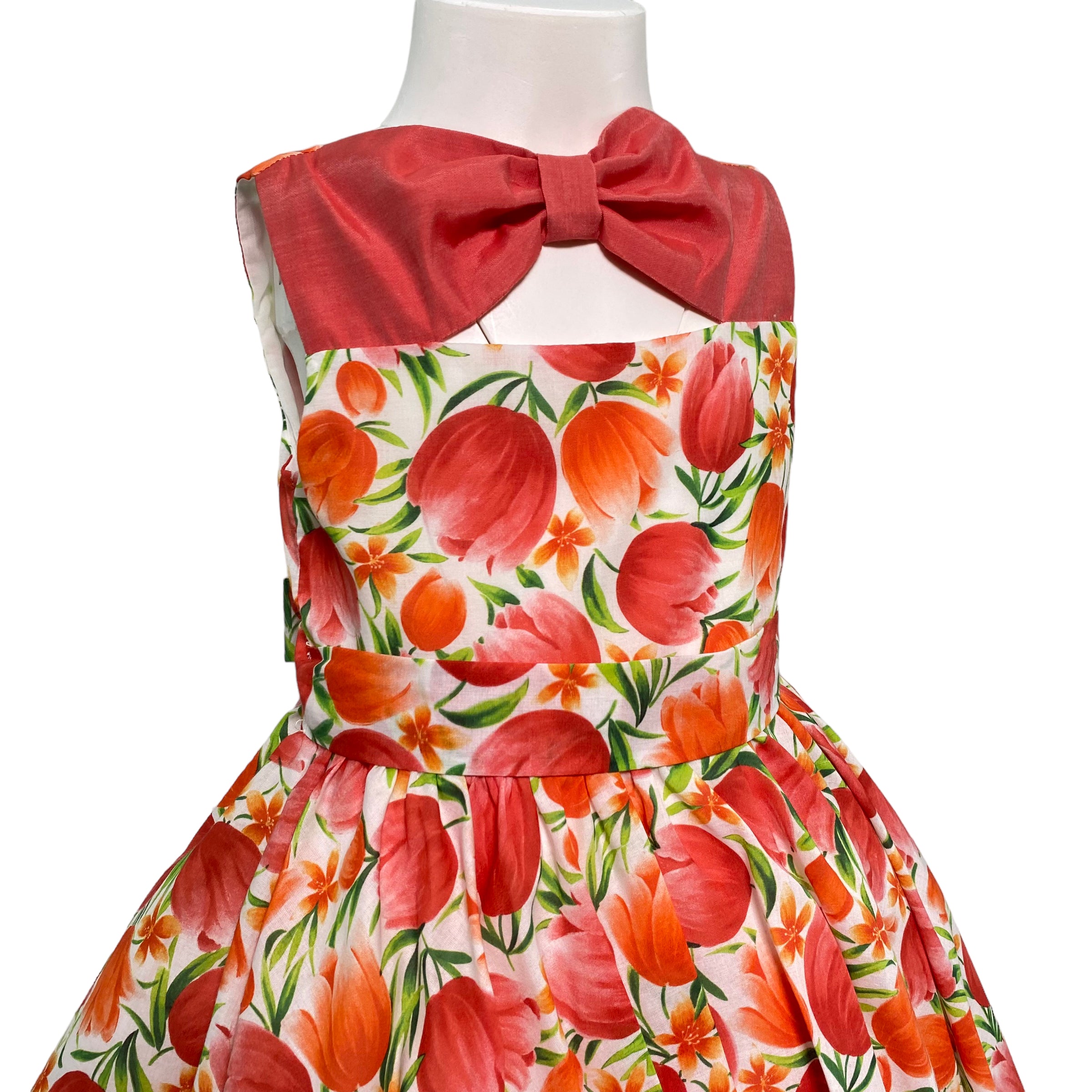 Abito elegante smanicato con stampa all over di tulipani, con corpetto stretto con fiocco sul petto, e gonna ampia a bambolina.