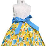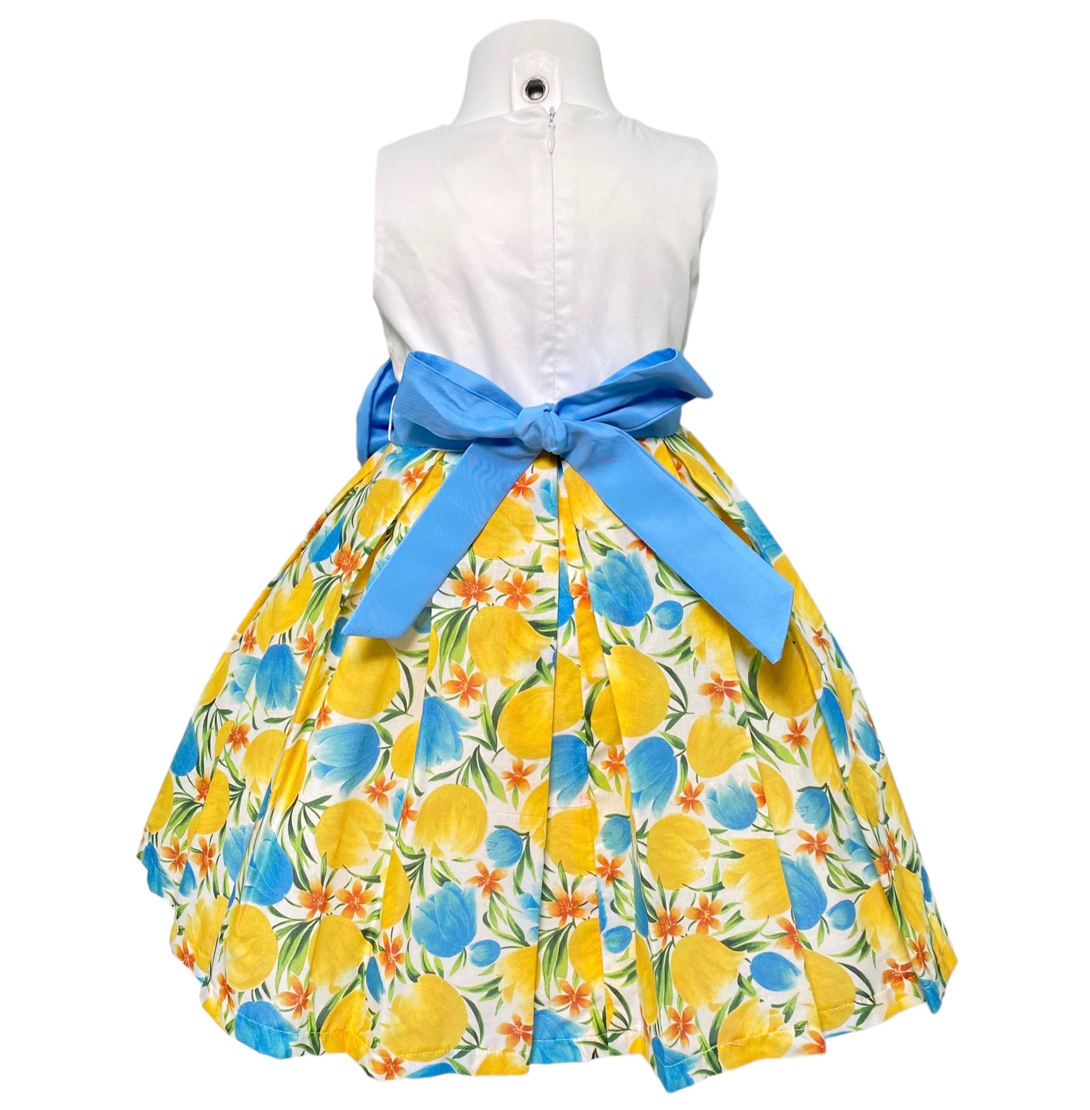 Abito elegante smanicato con corpetto bianco e gonna ampia a bambolina con stampa di tulipani.