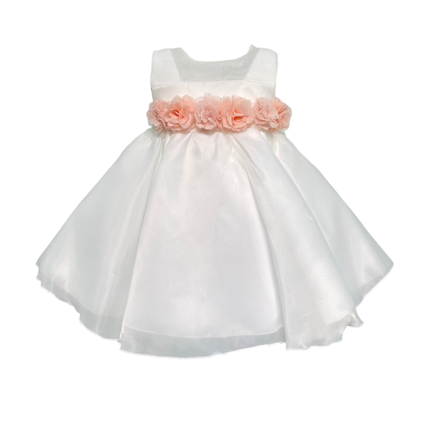 Abito elegante smanicato in organza, con gonna ampia a ruota e cintura in vita con applicazione di fiori.
