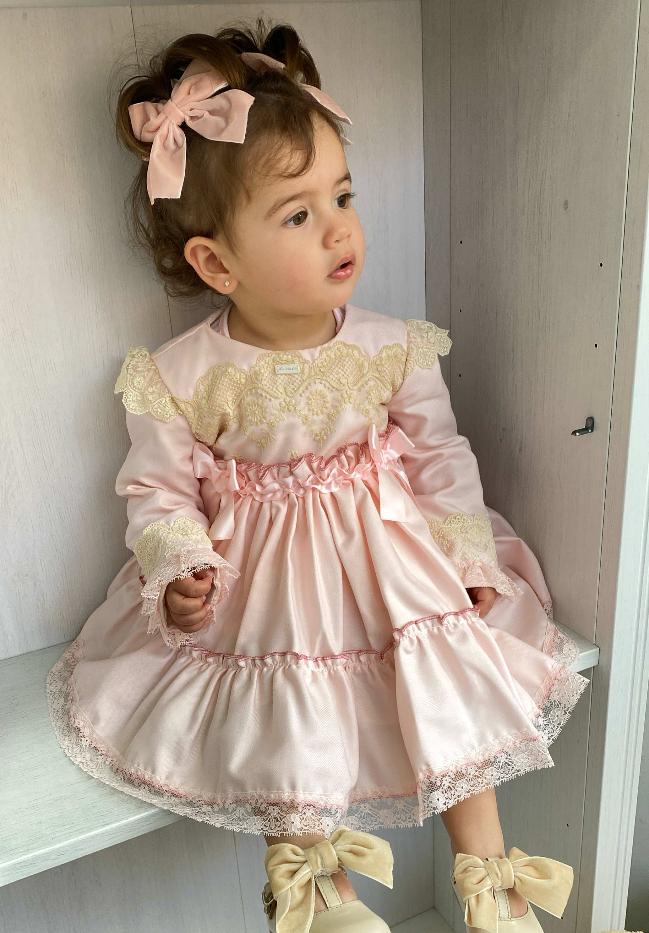 Abito manica lunga elegante svasato, con applicazione di pizzi e fiocchi in raso sul petto.