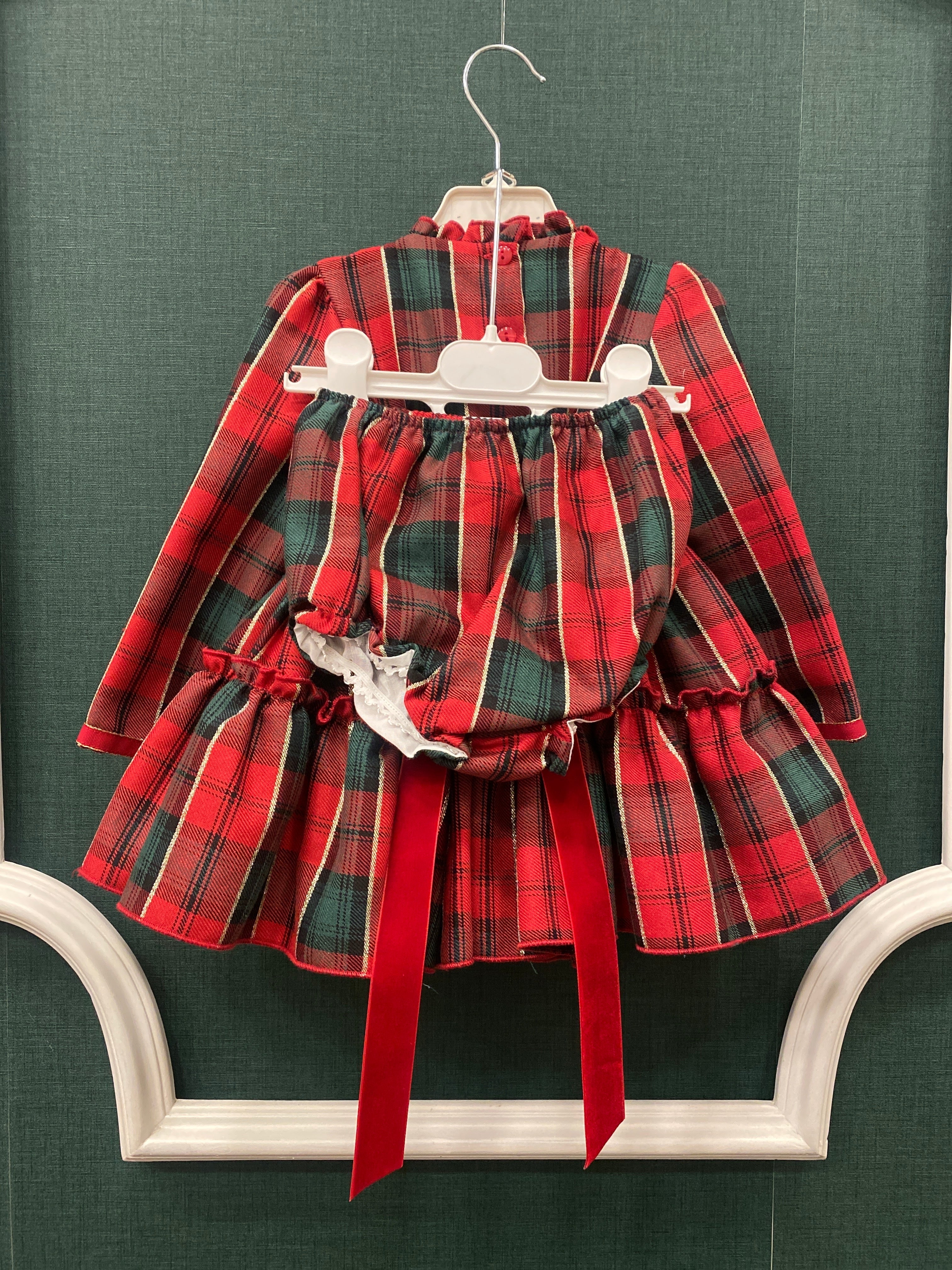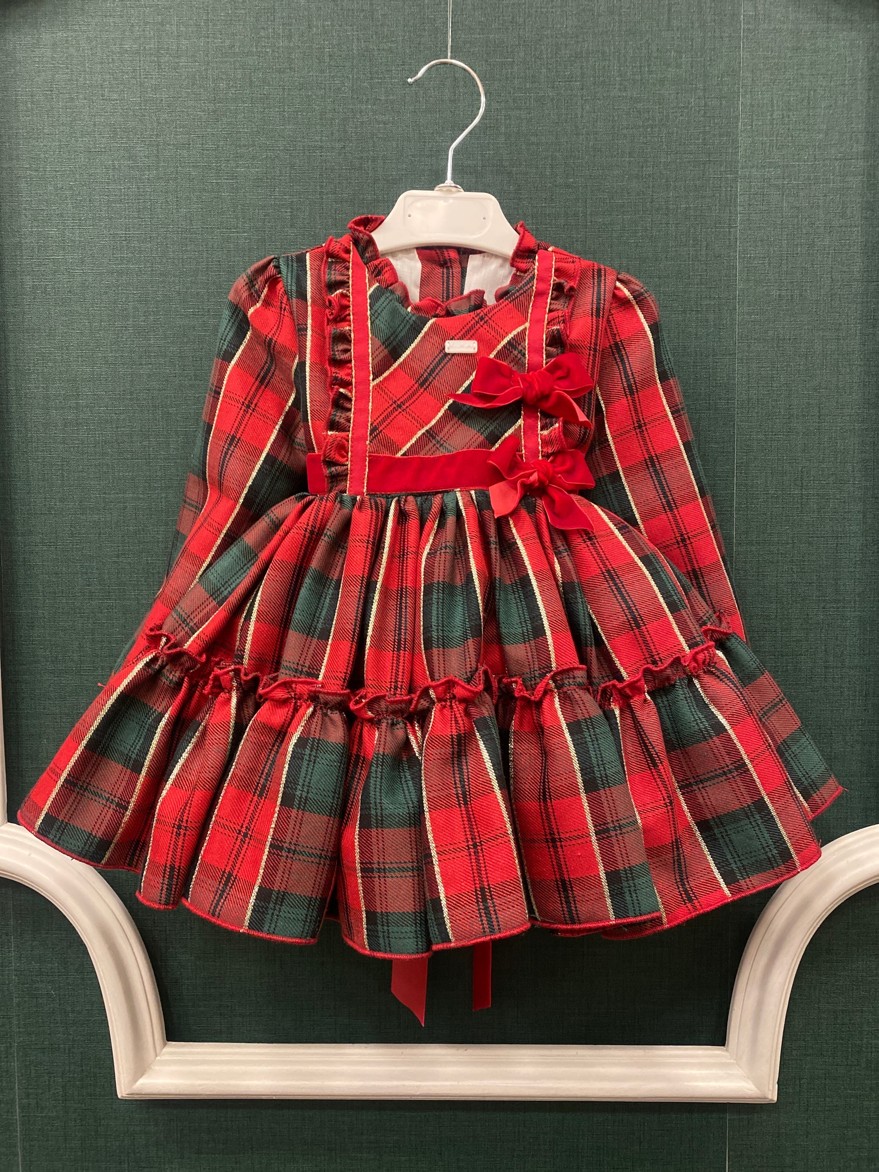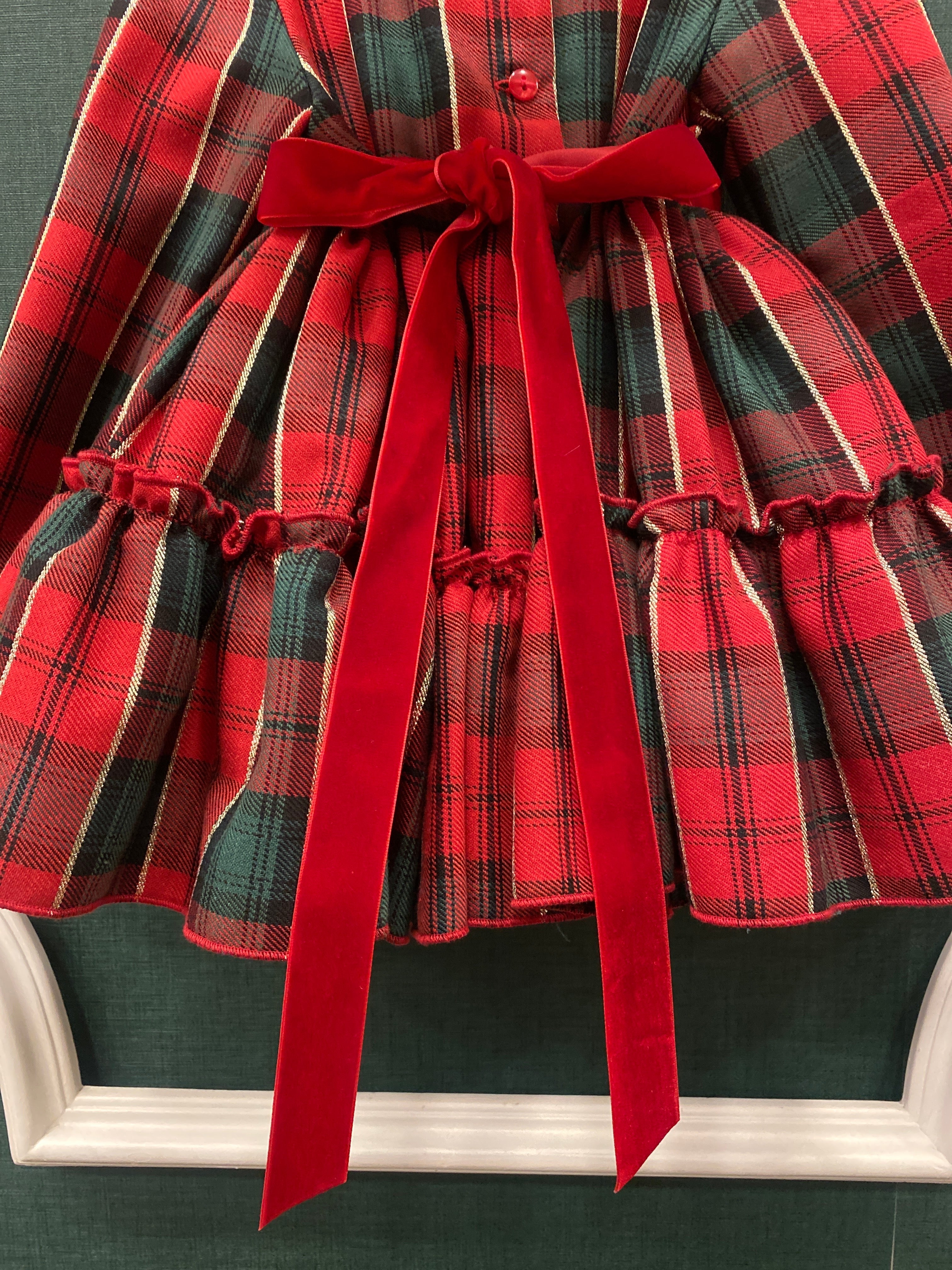 Abito manica lunga elegante svasato, fantasia scozzese, con balze e fiocchi in velluto rosso in vita.