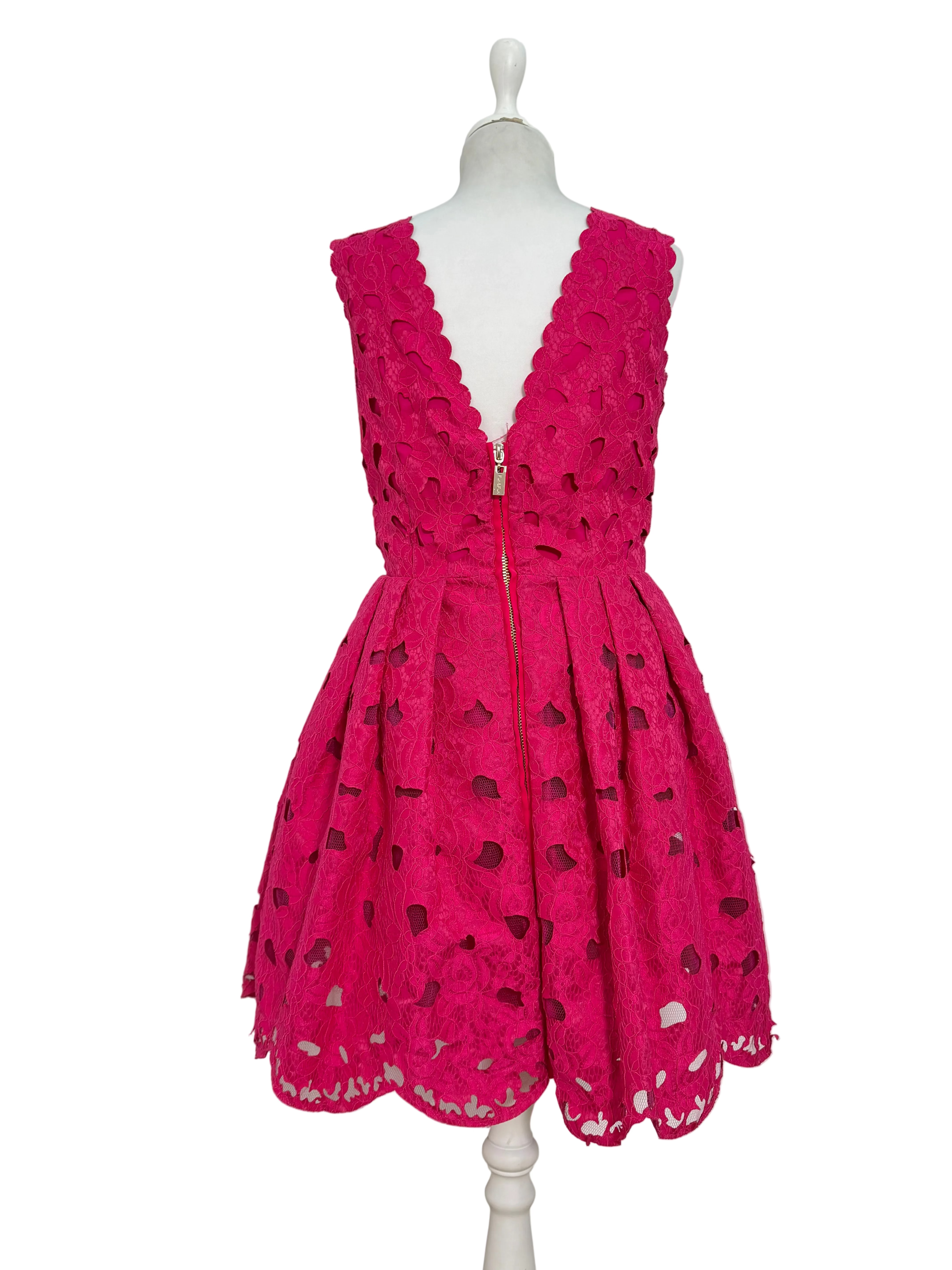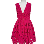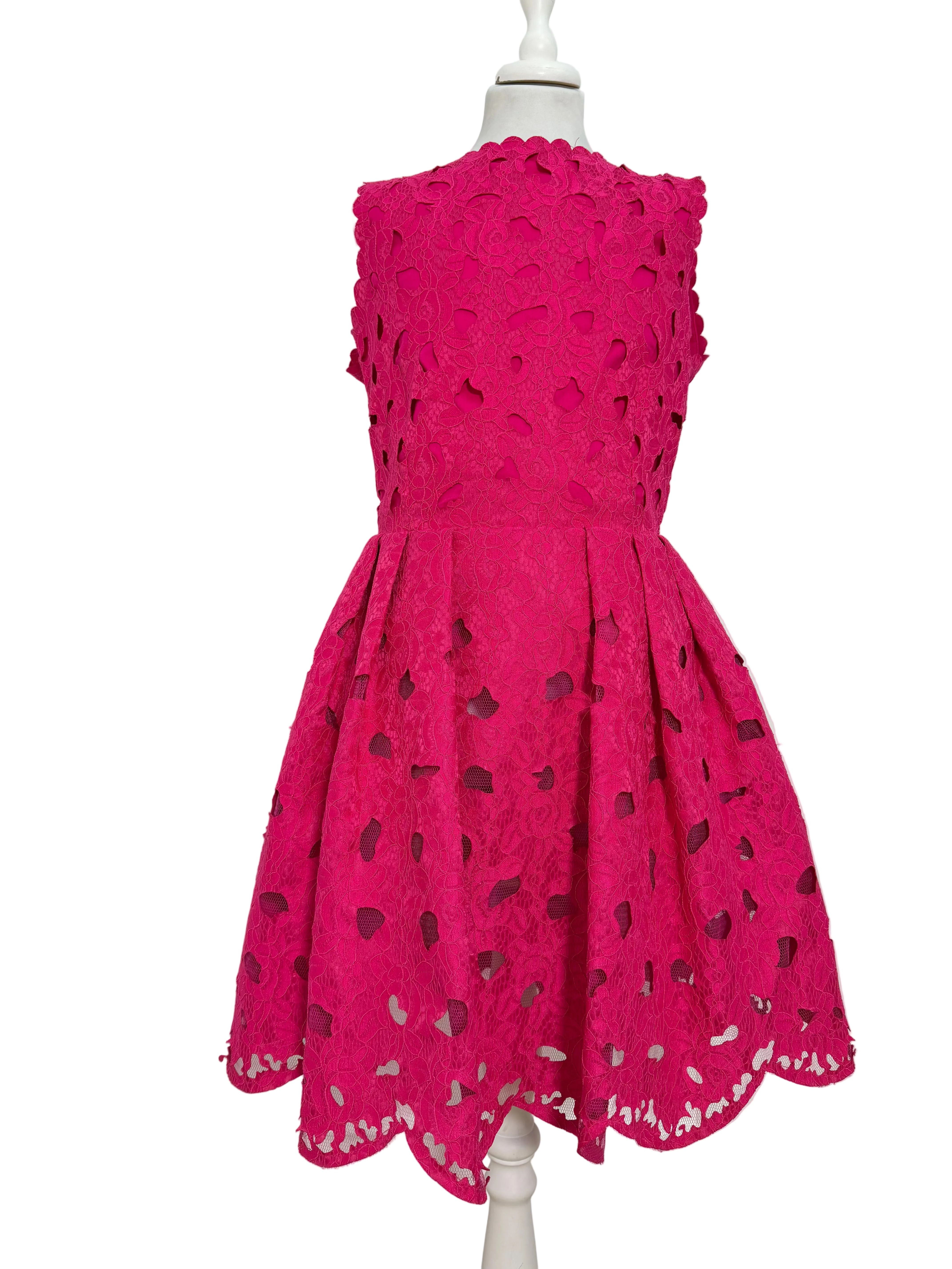 -Abito elegante smanicato e traforato fucsia in tinta unita con ricamo di fiori in rilievo