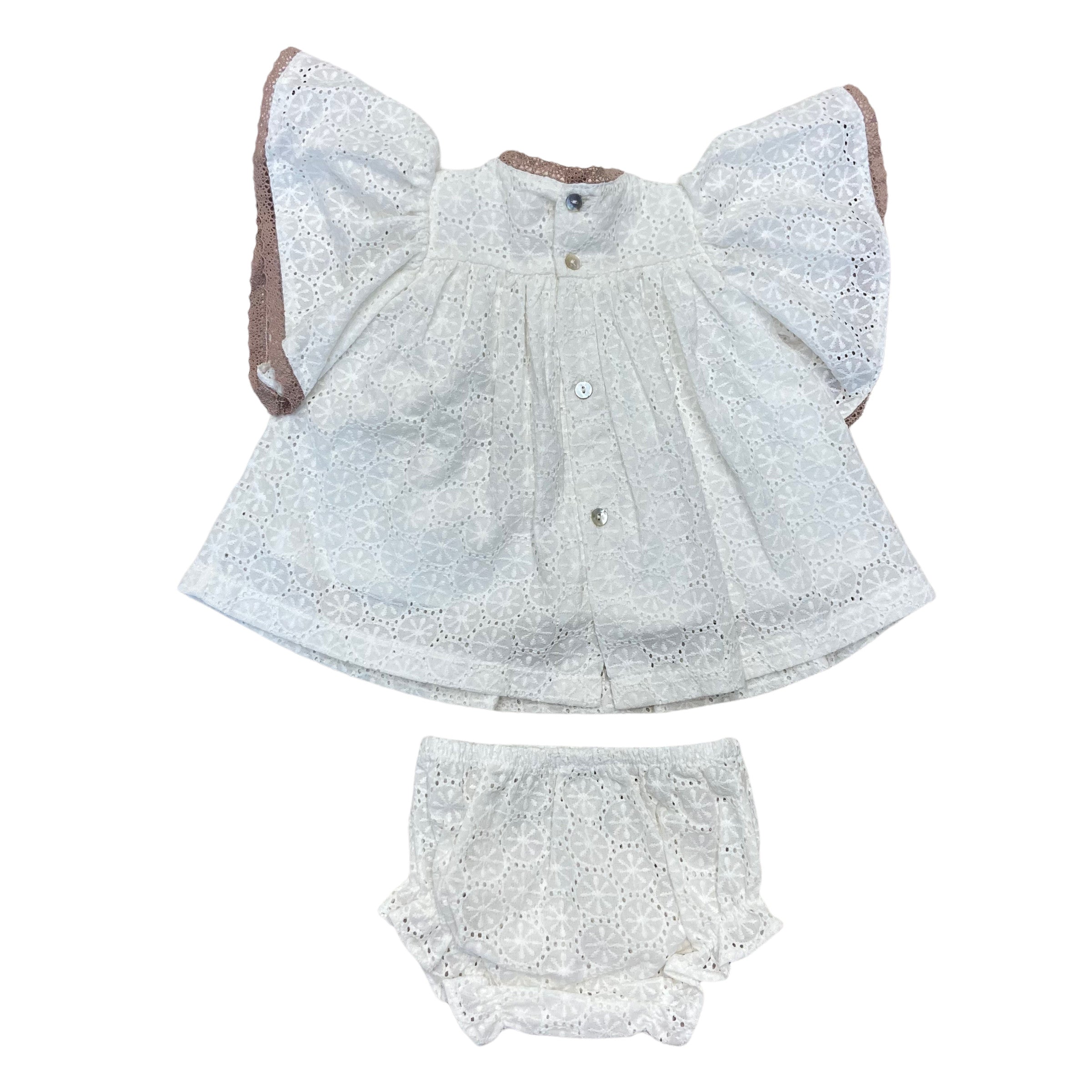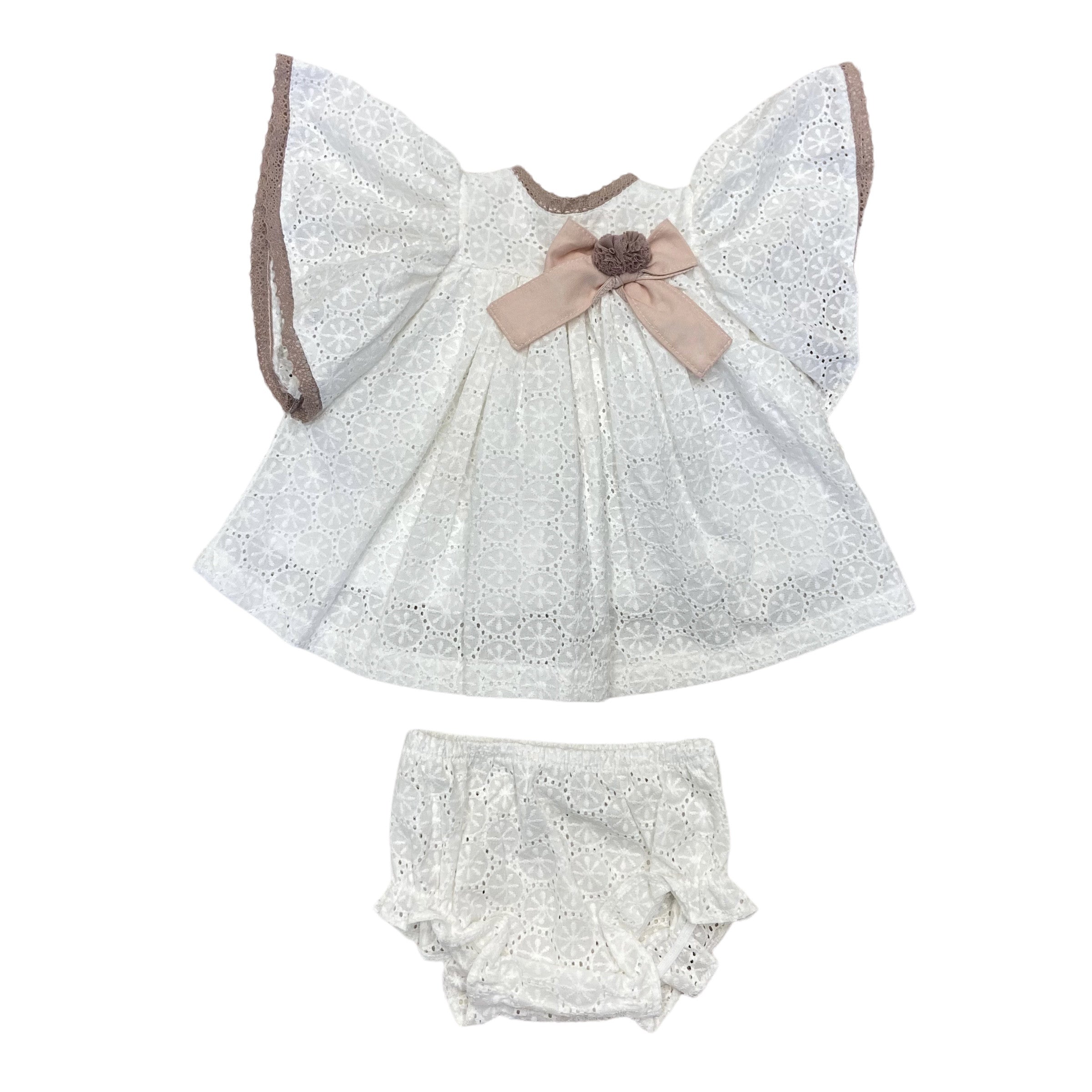 Abito giro manica con ruches in pizzo san gallo bianco con ricami in filo rosa antico sul colletto e sull'estremità delle maniche. Bellissimo fiocco sul petto nella parte laterale