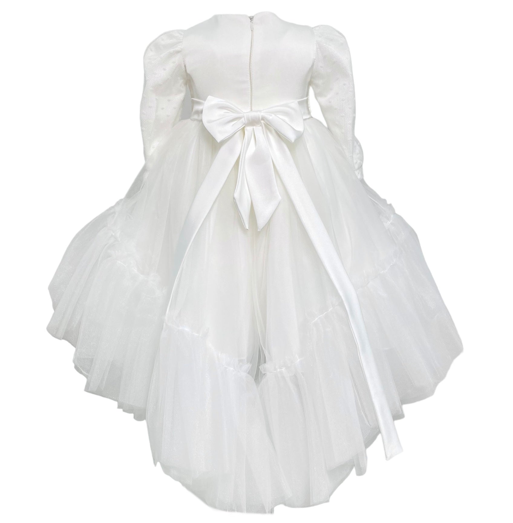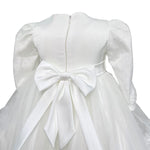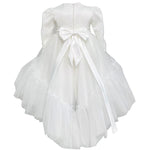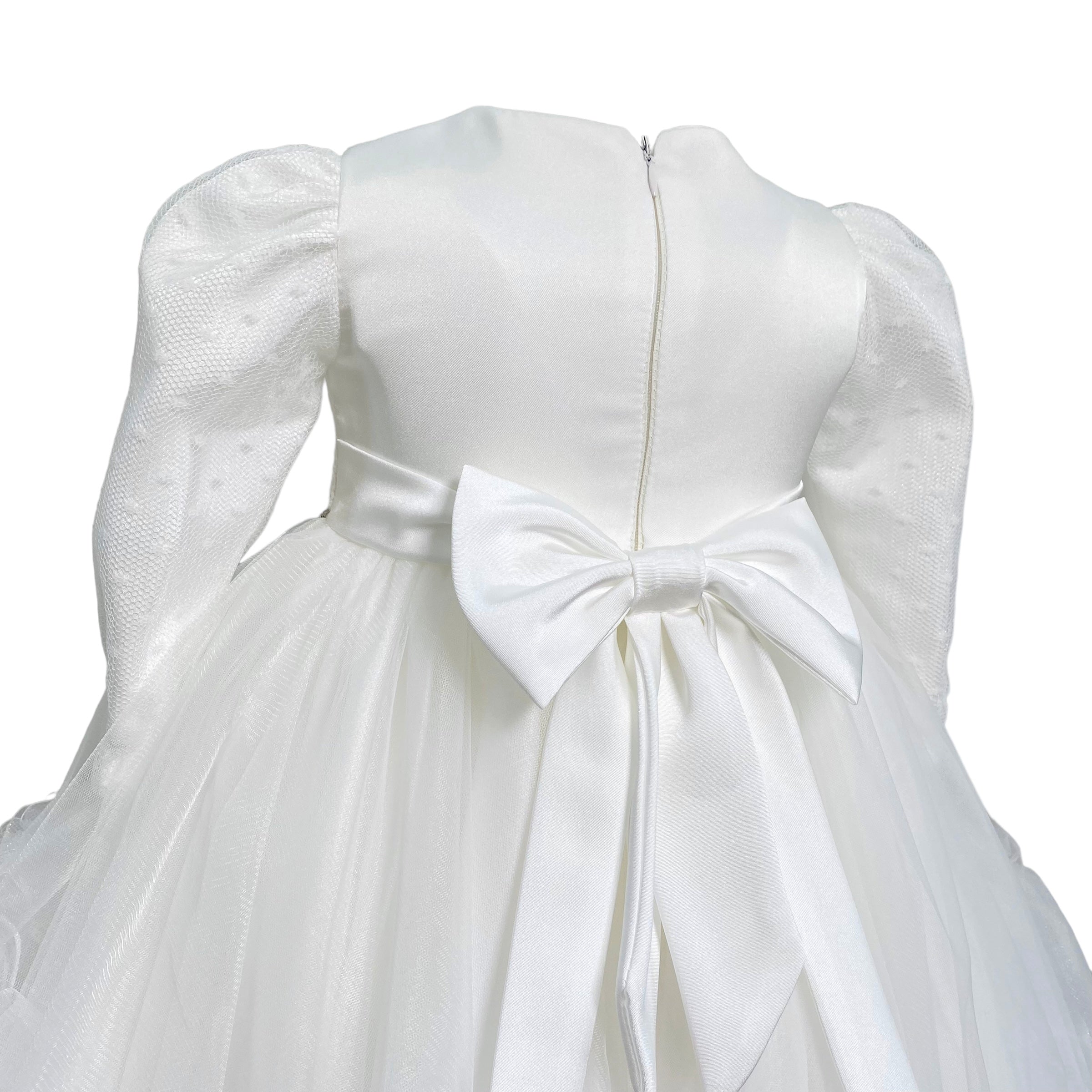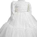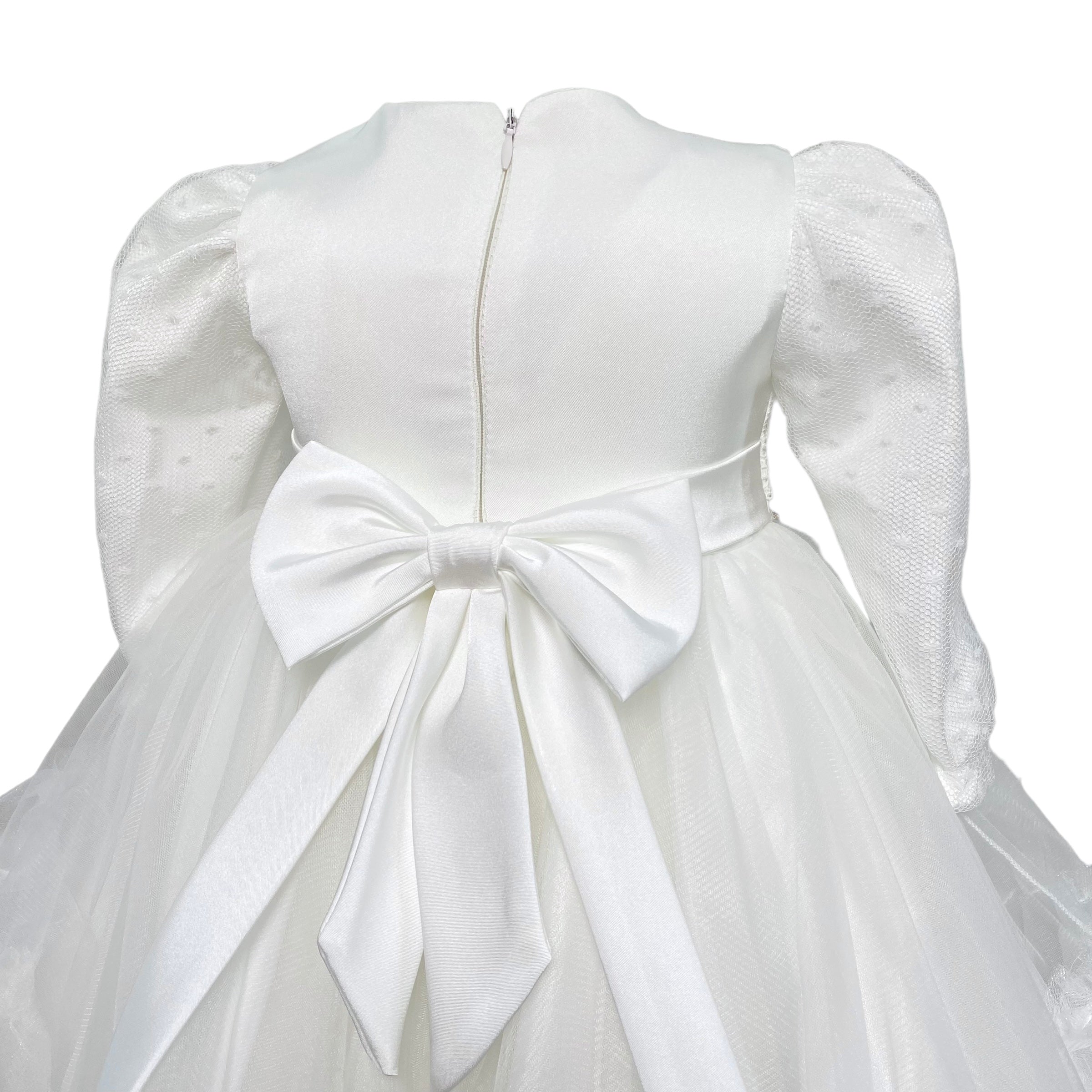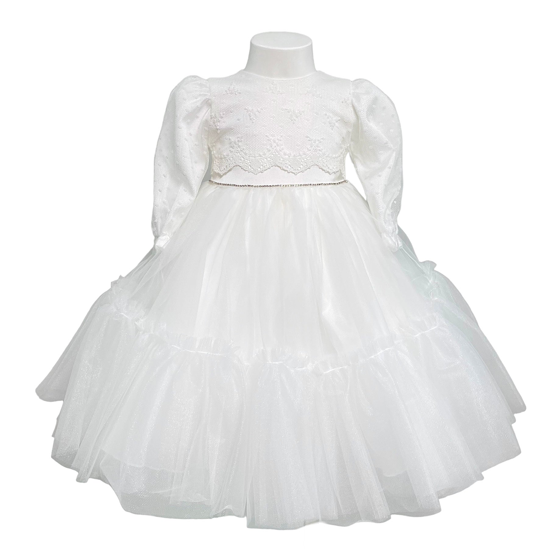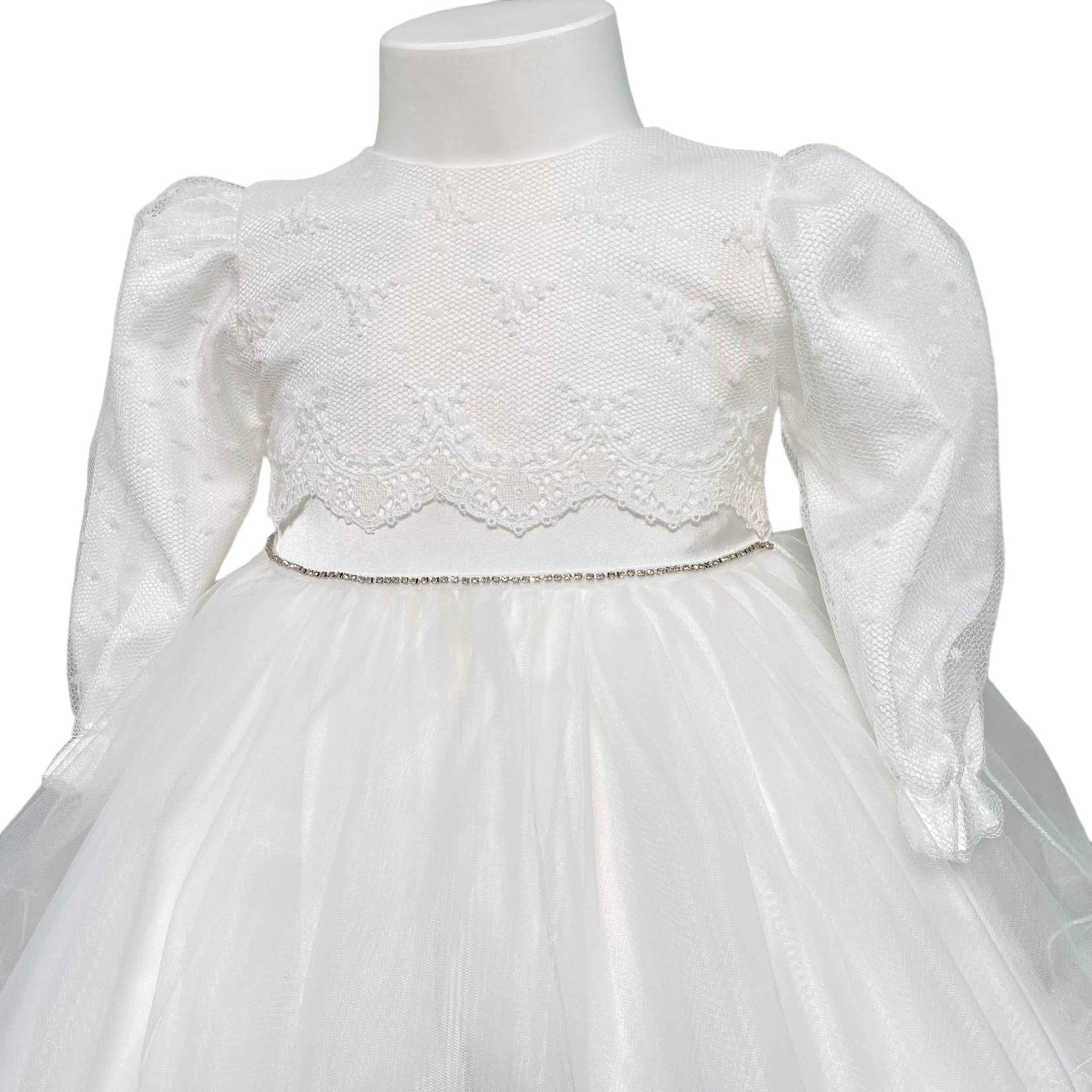 Abito lungo elegante battesimale in tulle, con corpetto in pizzo e applicazione di strass in vita,