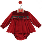 Questo Abito Neonata DEL SUR con culotte, manica lunga, collo squadrato e applicazione di rouche scozzese sul petto è elegante e raffinato. Il tessuto in velluto lo rende ancora più sofisticato, perfetto per un'occasione speciale.