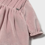 Vestito manica lunga per neonata con polsini elasticizzati. Girocollo. Apertura posteriore con cerniera invisibile. Confezione in velluto elegante e classico. Modello con riccio.