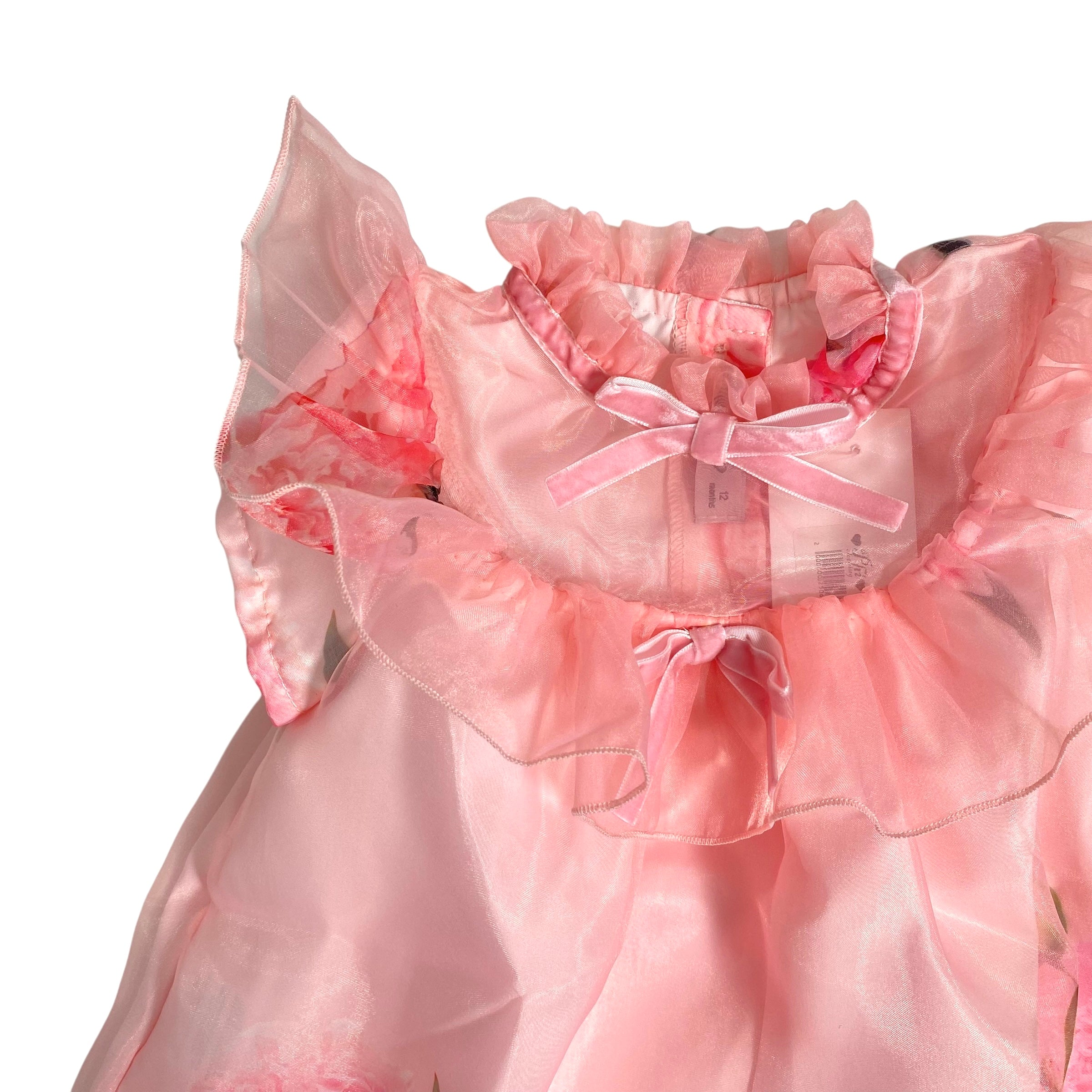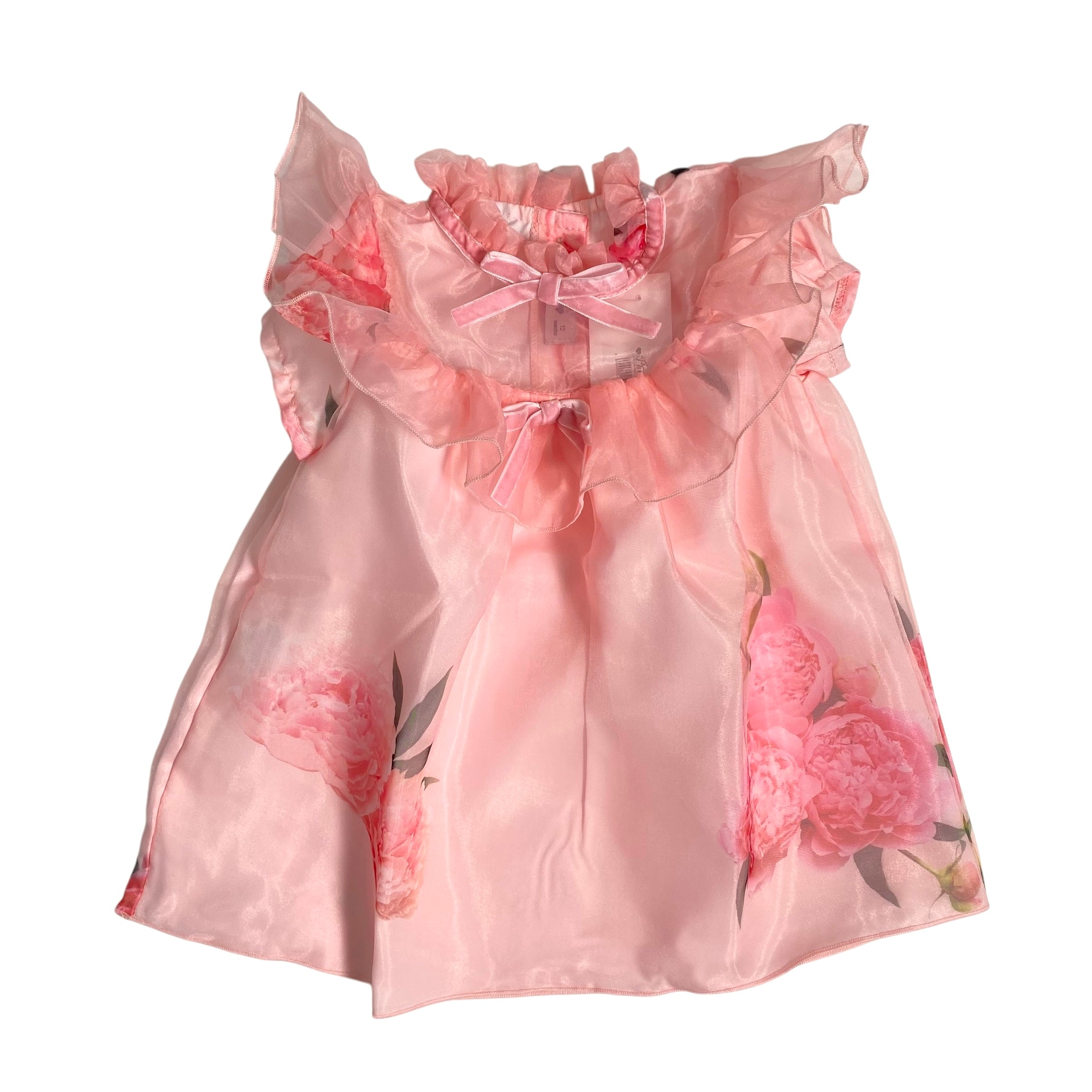 Uno splendido abito per occasioni speciali in organza rosa. Ideale per le feste, è  realizzato in organza leggera e setosa e foderato in morbido cotone. Rifinito con volant, ha una gonna ampia.  Chiusura con cerniera sul retro.