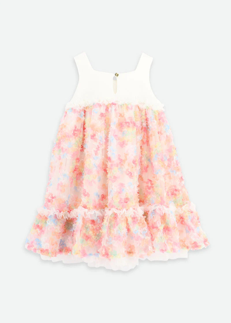 Grazioso abito multicolore bucaneve per bambina con voluminosa gonna in tulle 3D. il favoloso vestito presenta un fiocco in tessuto al centro del corpetto in cotone e si chiude sul retro con un ciondolo a cuore dorato.