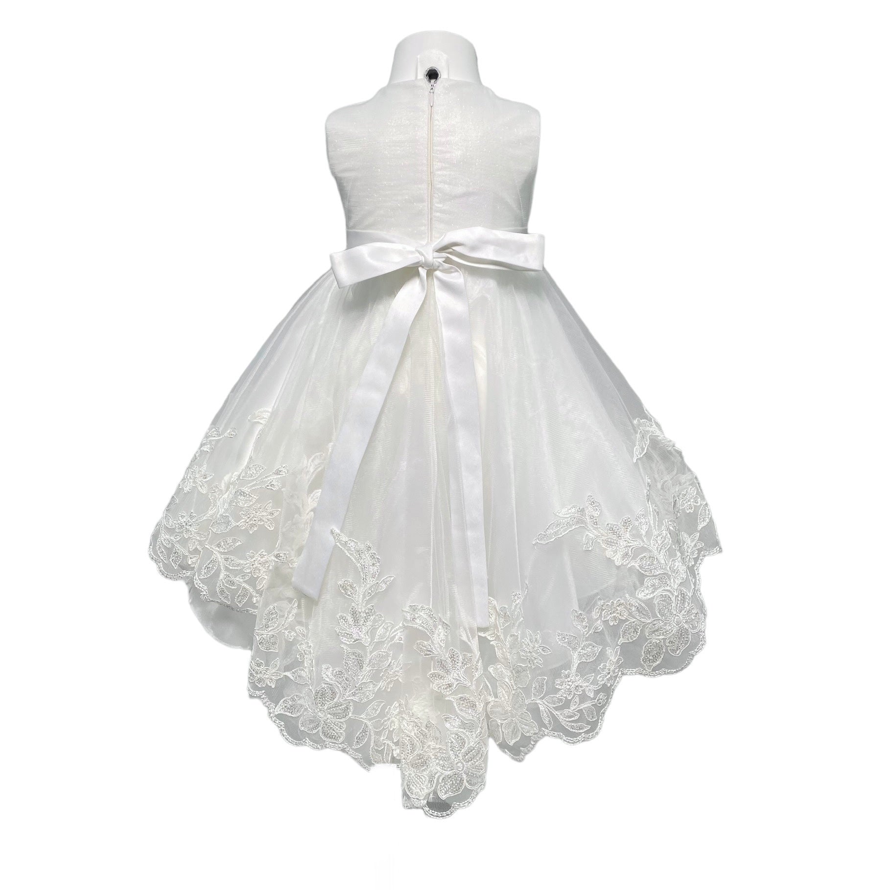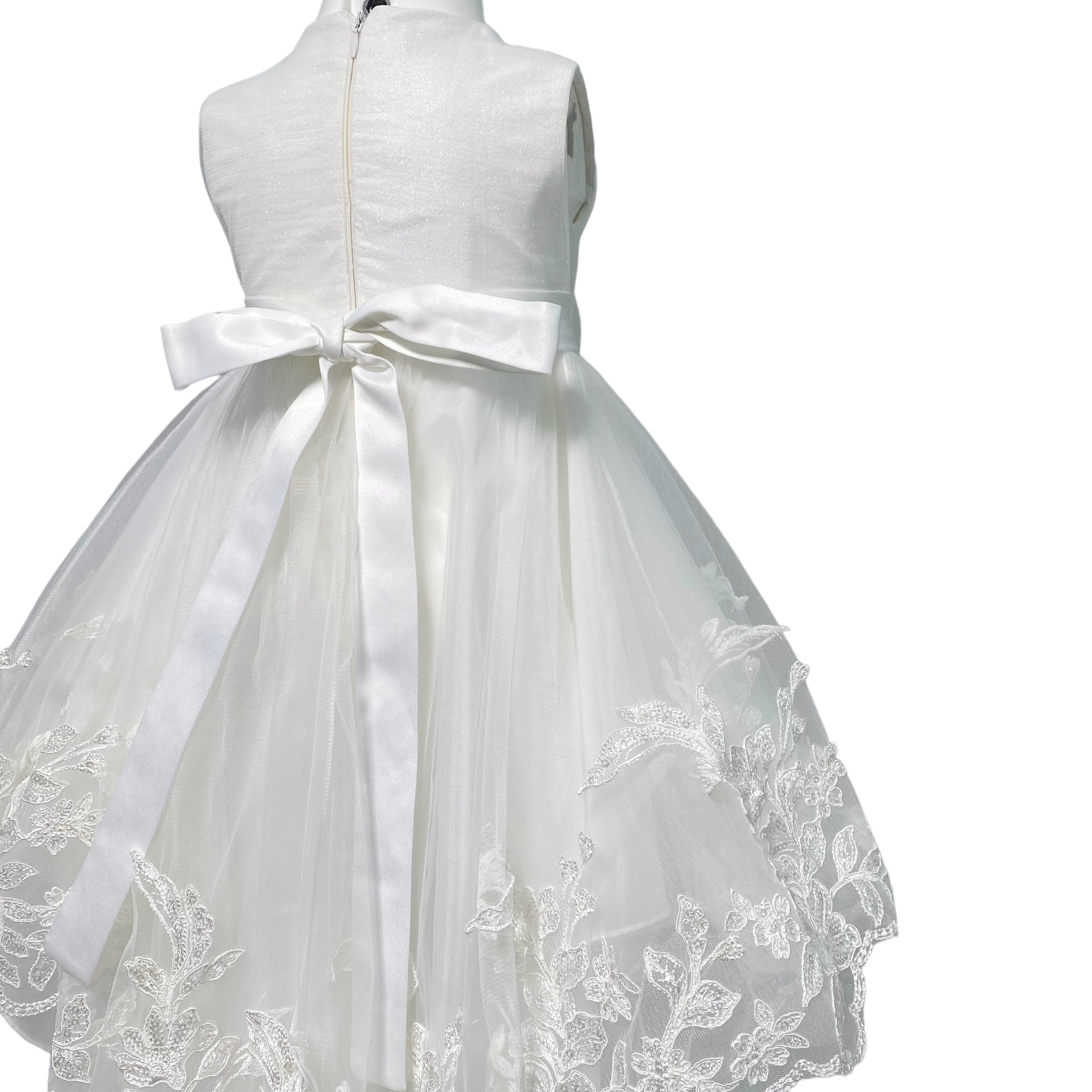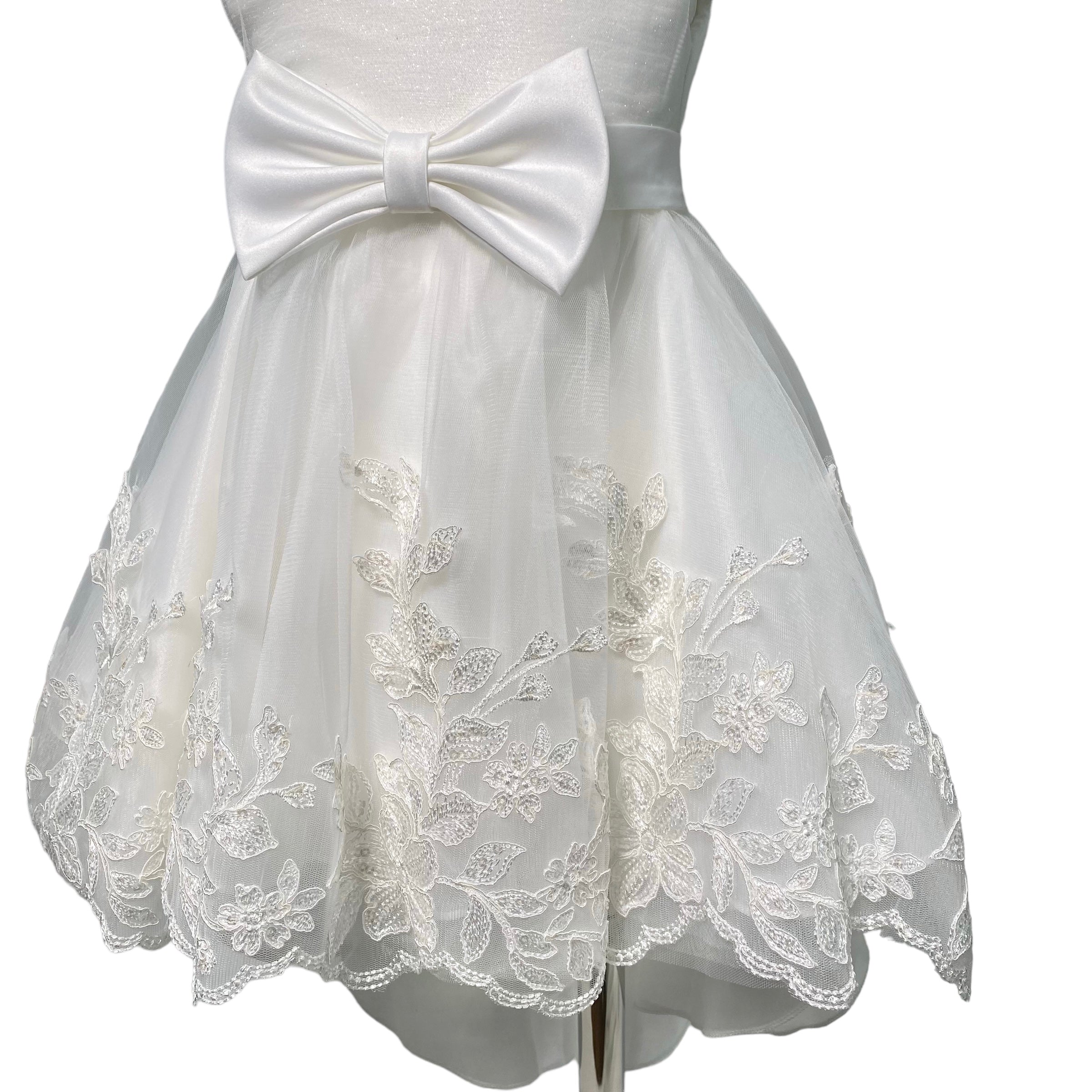 Abito smanicato a bambolina con leggero code', ricoperto interamente da pizzo leggermente glitterato.