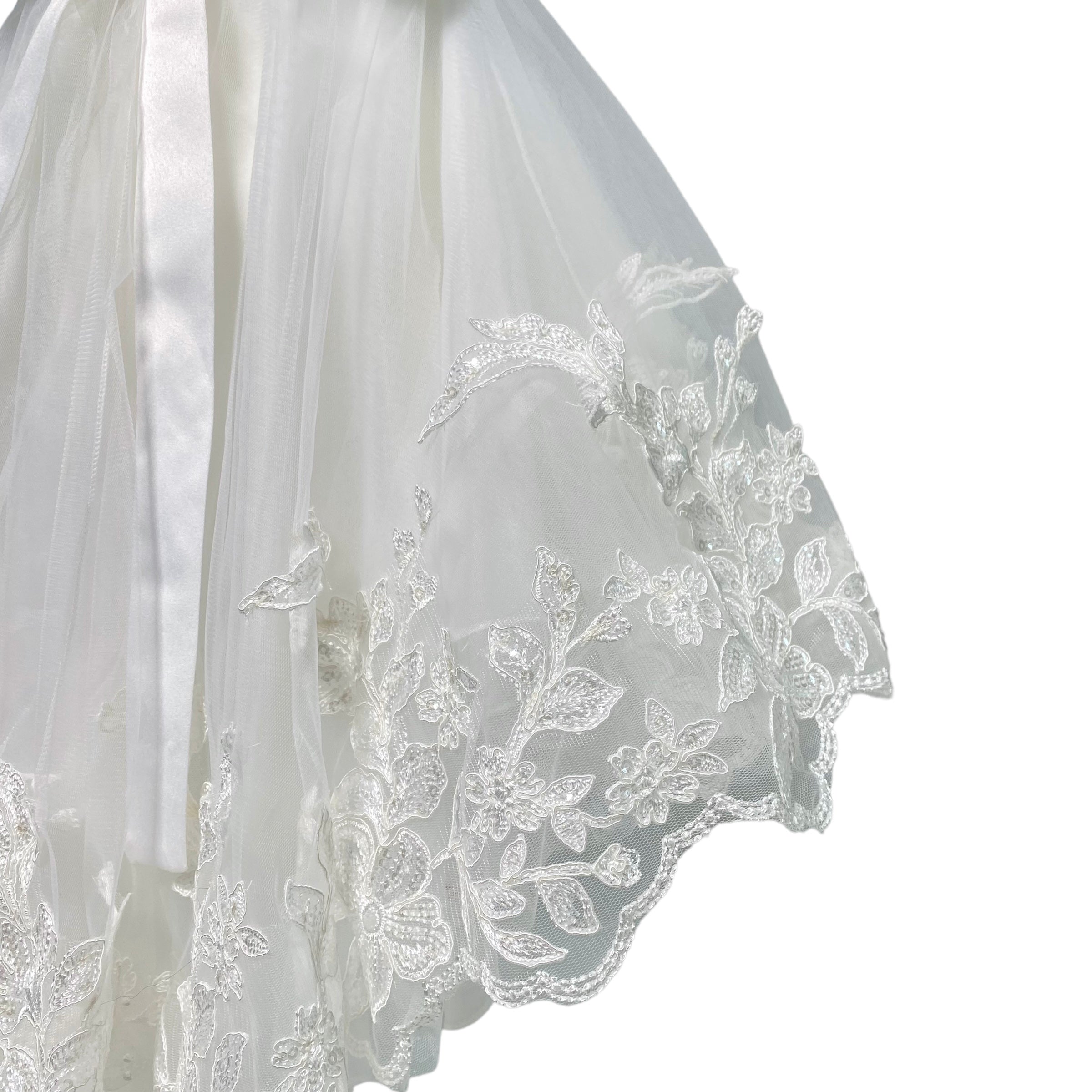 Fascia in raso in vita, con spilla di fiori ( removibile) sul davanti e fiocco sul retro.