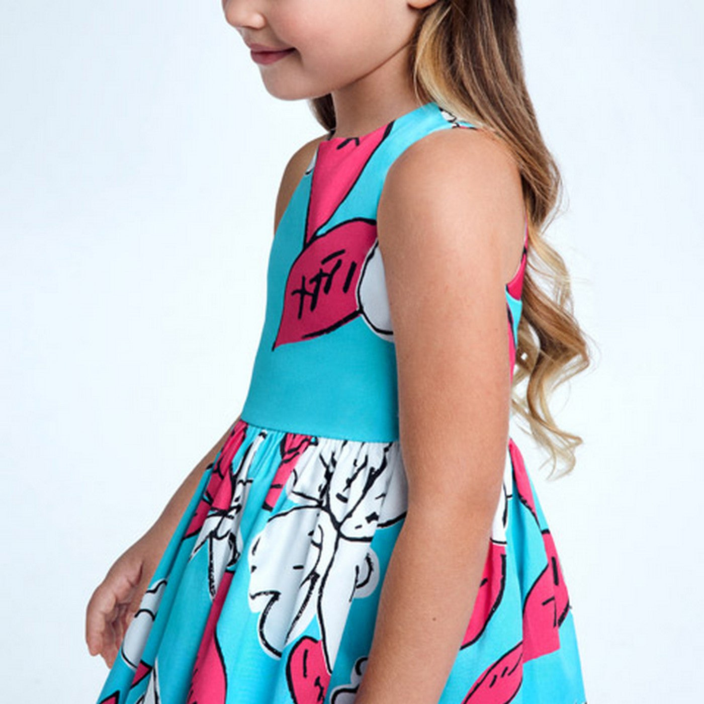 Abito smanicato in cotone celeste con stampa colorata.