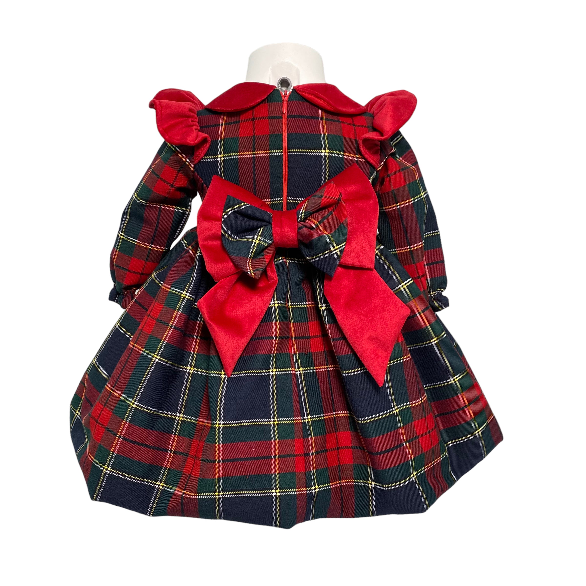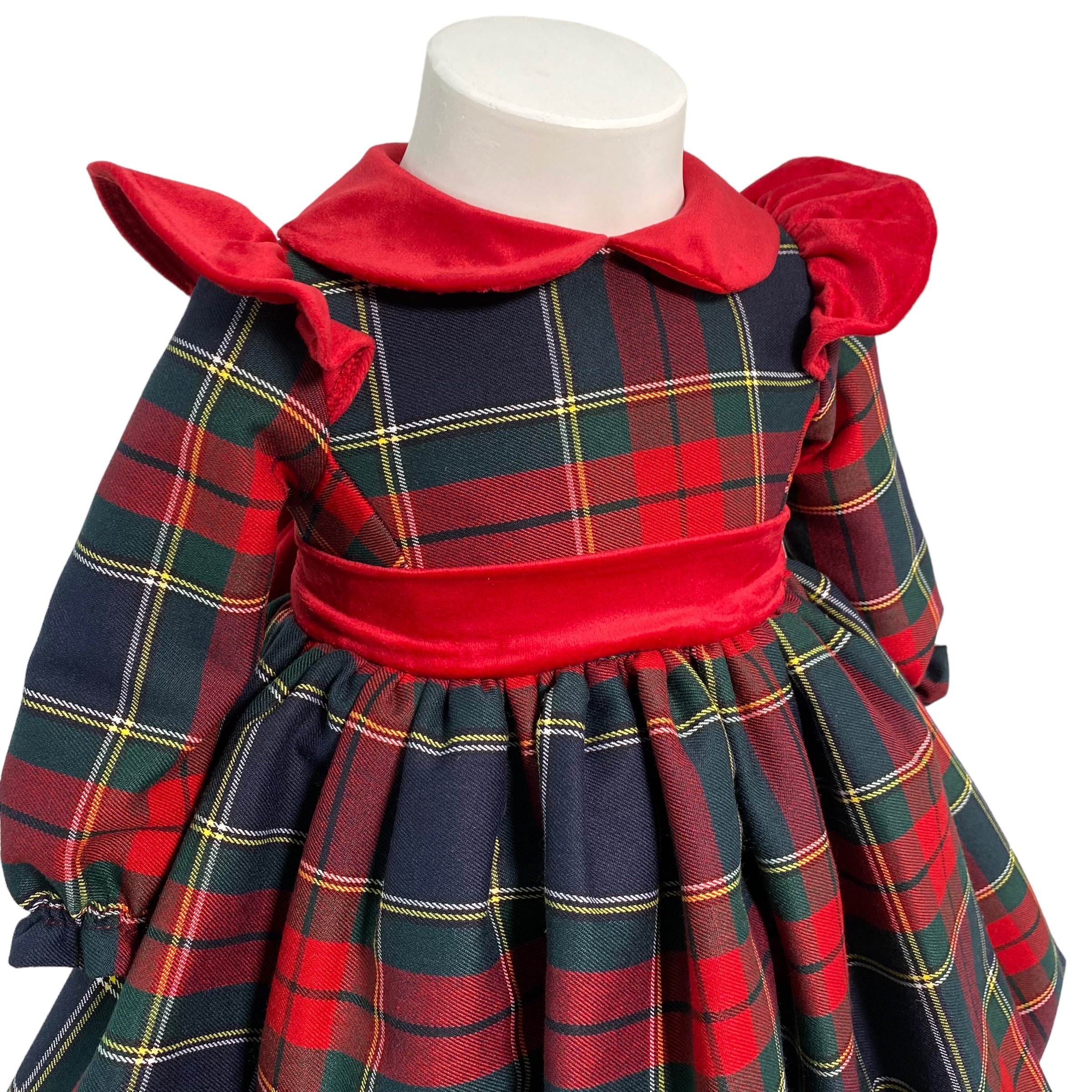 Abito svasato manica lunga, fantasia scozzese, con colletto e fascia in velluto rosso.