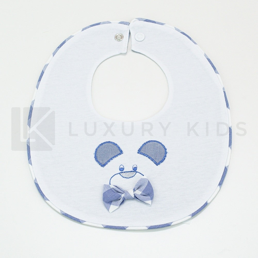 Bavetta in cotone bianca con profilo con quadri blu, retro in tessuto blu.