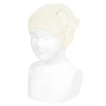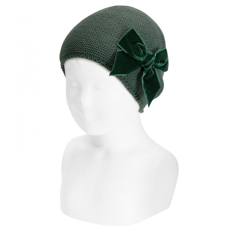 Berretto a punto legaccio con fiocco in velluto in diverse colorazioni.