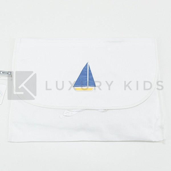 Busta nascita in cotone bianca con ricamo di barca a vela sul davanti.