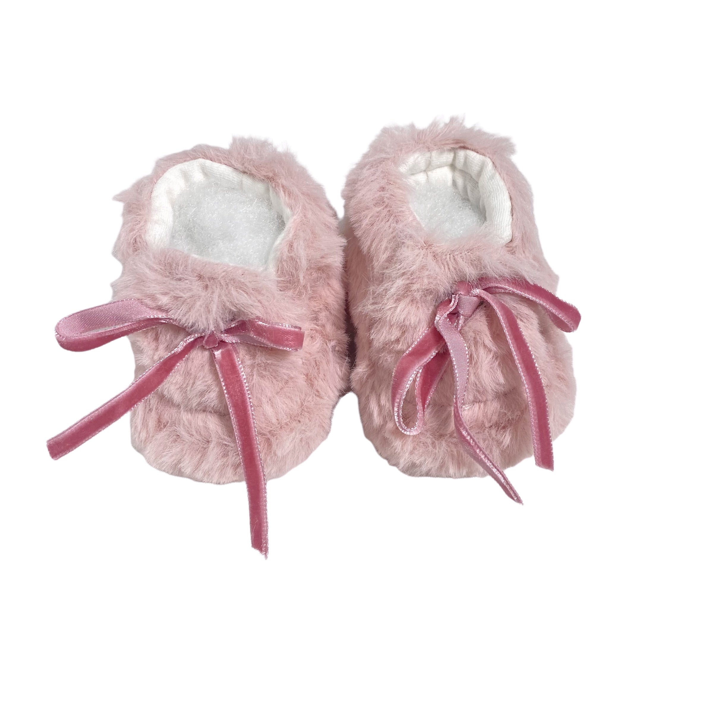 Calzino scarpetta in ecopelliccia rosa, con nastrino in velluto rosa forte.